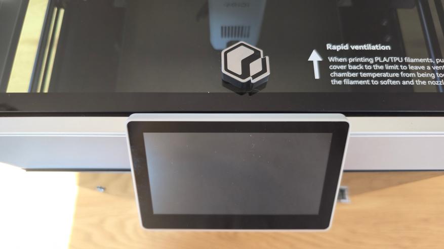 QIDI Q2 выполнен в форм-факторе закрытого корпуса. Передняя часть почти полностью отдана под прозрачную дверцу из закаленного стекла. Она закреплена на скрытых петлях, открывается мягко и без перекосов, а при закрывании плотно прижимается к уплотнительной полосе по периметру, в определенной мере этому способствуют два магнита, установленных на дверце. Такое решение обеспечивает изоляцию рабочей камеры и помогает удерживать внутри стабильную температуру и минимизировать запахи при печати. На нижней панели спереди нанесен логотип производителя, в верхней части встроен сенсорный экран с цветным интерфейсом. Он используется для управления устройством.