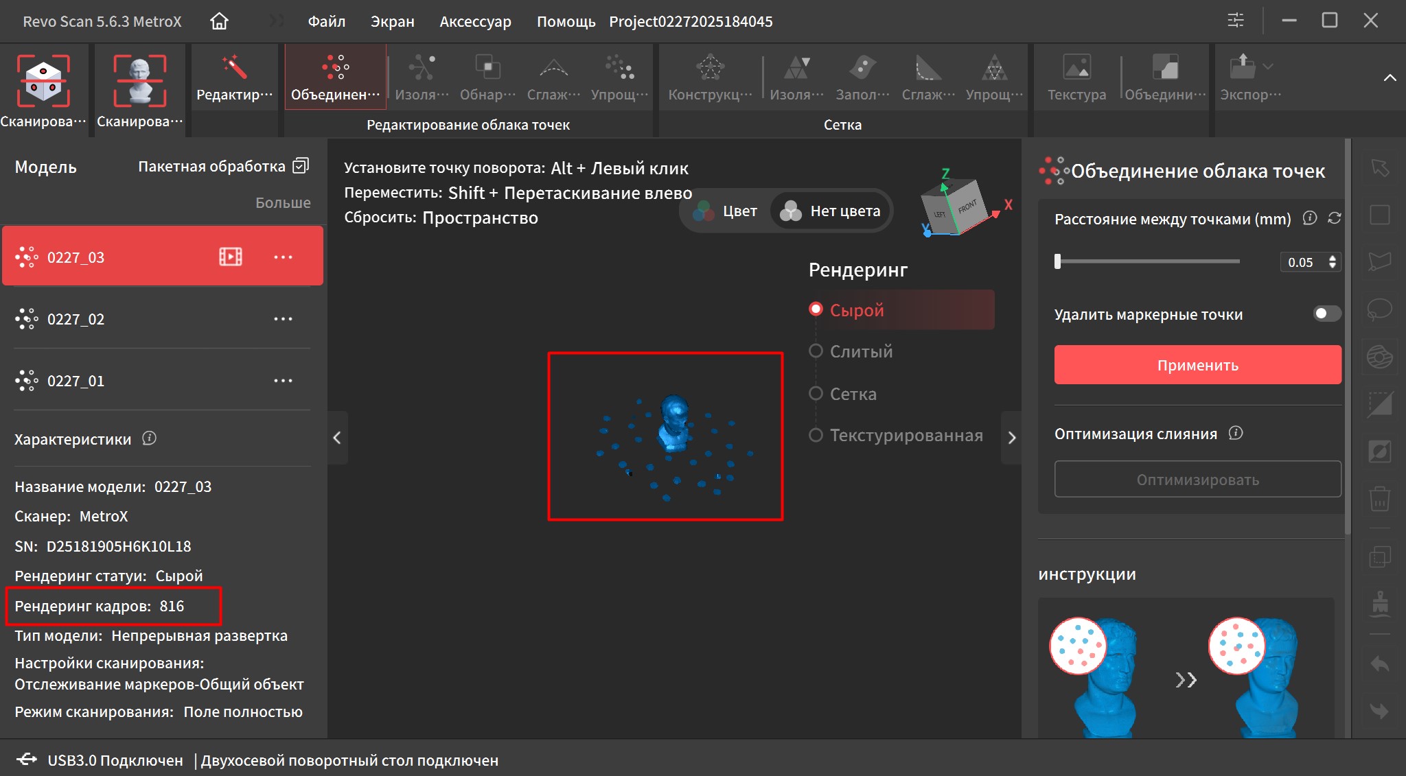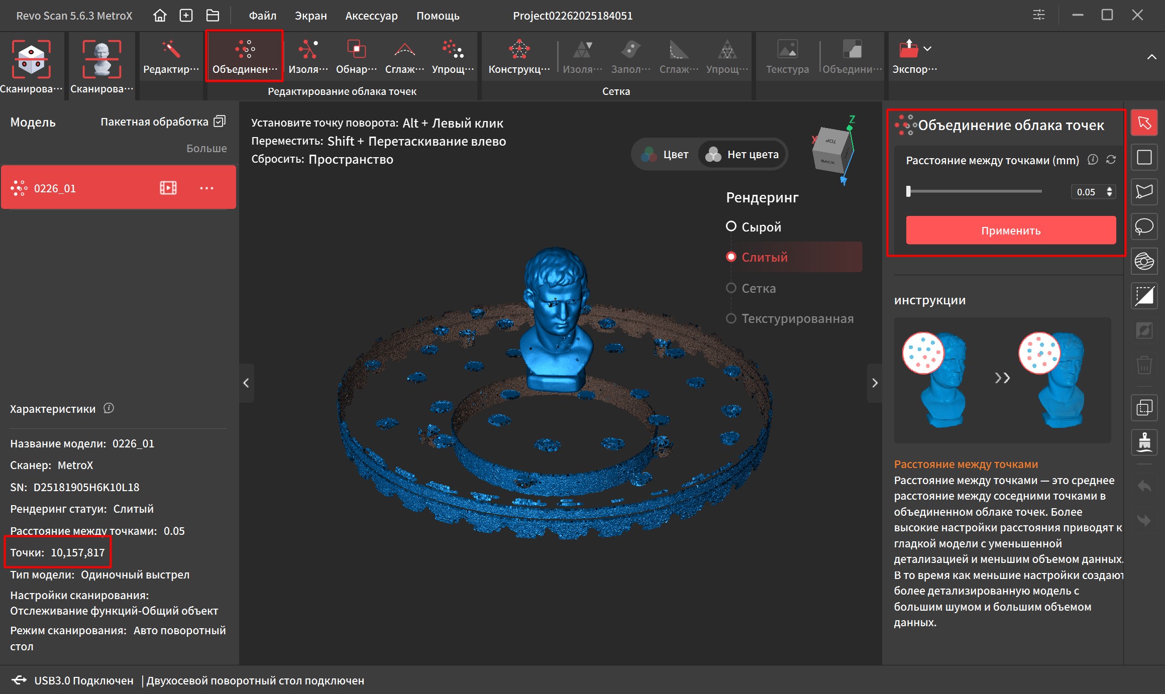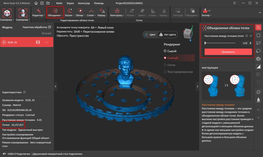 Далее нам нужно объединить облако точек этих кадров. Я поставил минимальное расстояние между точками 0.05мм, чтобы получить максимальную детализацию. После этого в характеристиках вместо кадров начали отображаться точки, которых сформировалось более 10 миллионов.