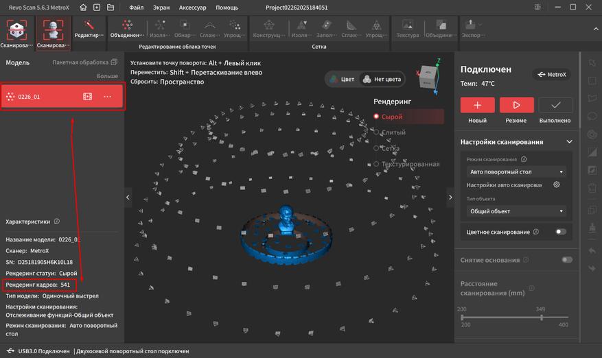 Благодаря нововведениям, сканирование занимает ощутимо меньше времени и при желании можно создавать 3Д модели крупных объектов. Для этого поворотный стол уже не подходит и требуется клеить на поверхность маркерные точки.