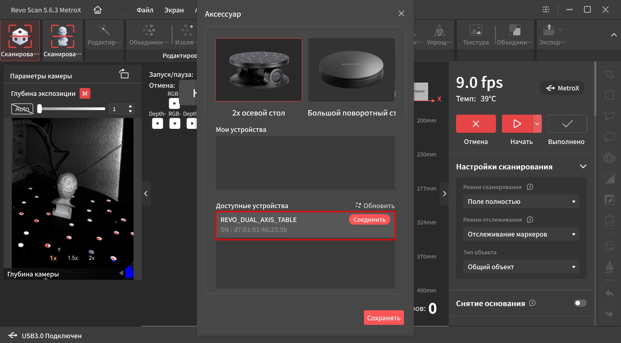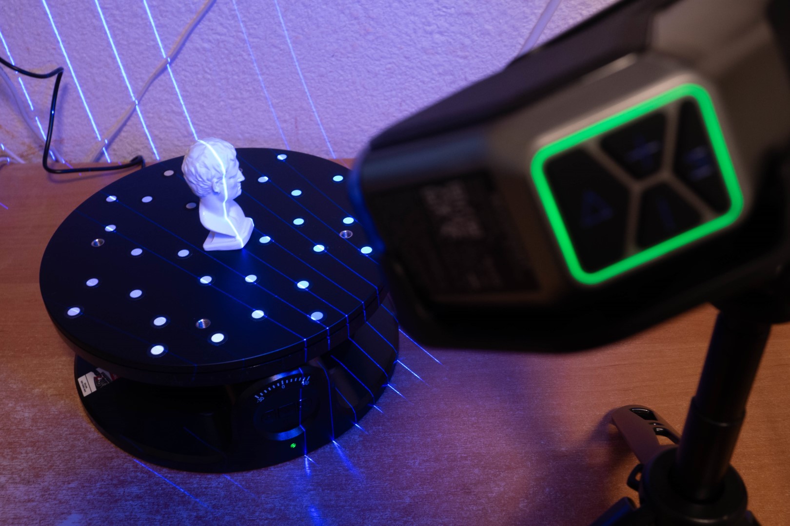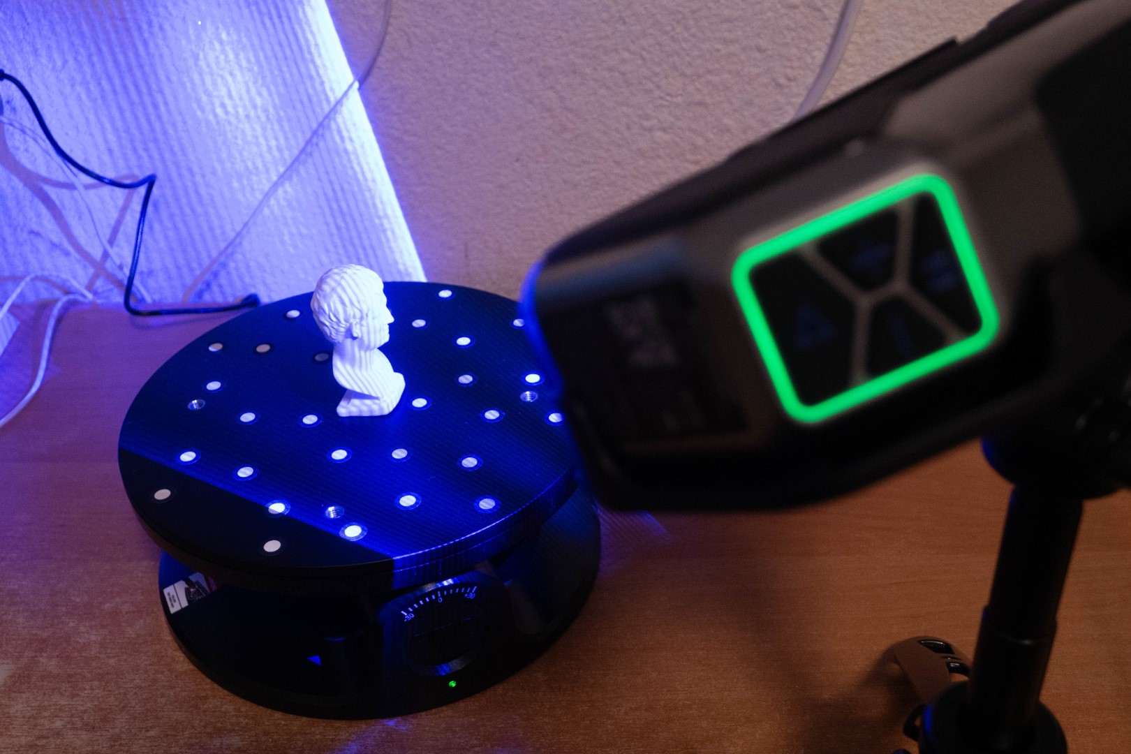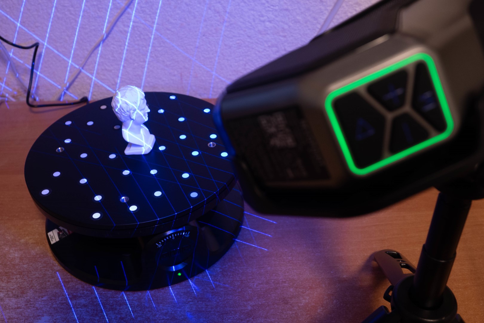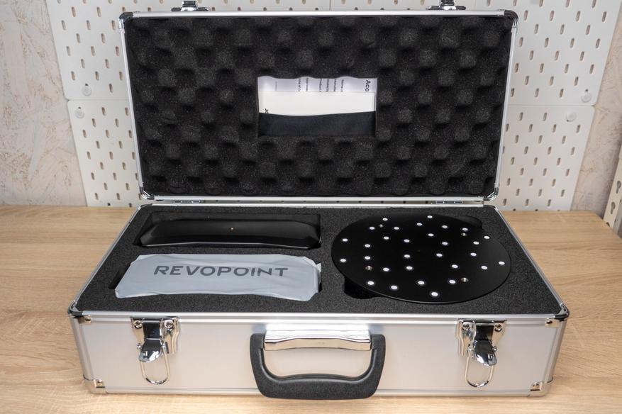 Он также имеется в комплекте, при чем не просто поворотный, но еще и двухосевой. Это значит, что он умеет наклоняться вбок после нажатия кнопки на корпусе, в приложении для телефона, либо автоматически после привязки в RevoScan. Очень годная штука, которая заметно упрощает сканирование небольших объектов в режиме структурированного света и не только.