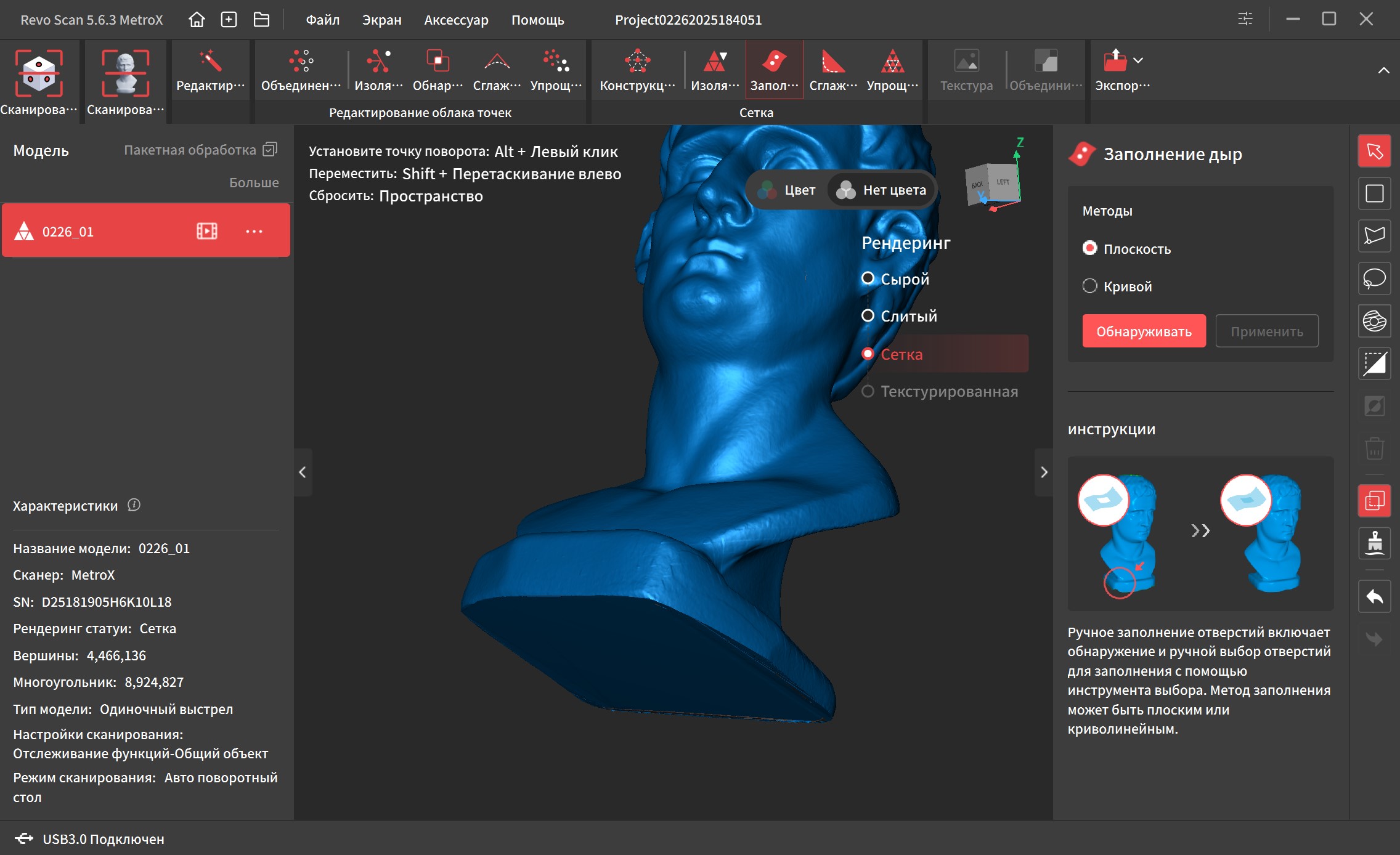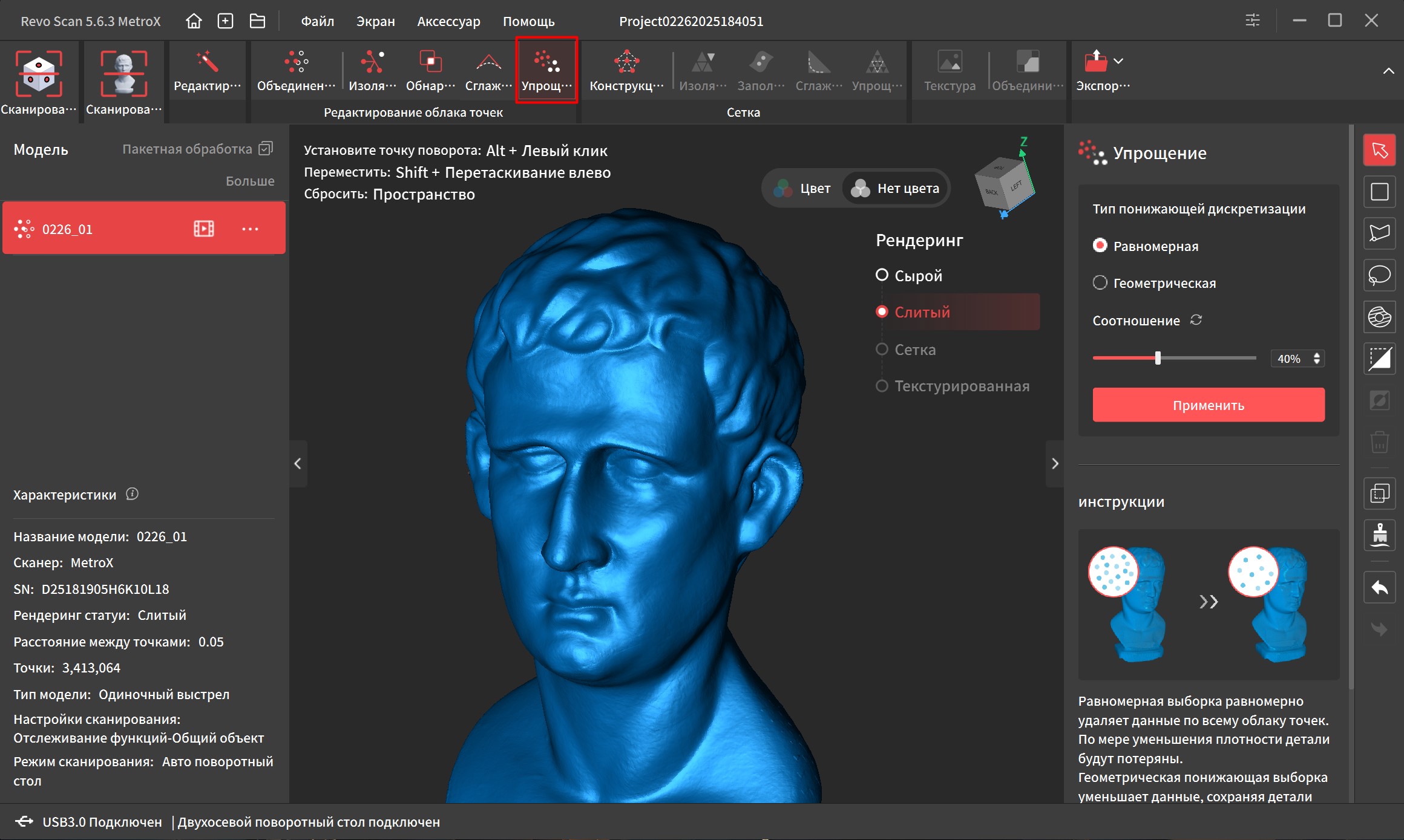 «Обнаружение совпадений» проверяет нет ли наслоений точек на поверхности и под ней. Сглаживание убирает выступающие углы и делает поверхность более плавной, но я редко этим пользуюсь, т.к. мелкие детали так же «съедаются». «Упрощение» уменьшает общее количество точек и увеличивает расстояние между ними. Выручает при сканировании крупных объектов, у которых отсутствуют мелкие детали. После удаления всего лишнего, количество точек снизилось с 10 миллионов до 3 миллионов, так что компьютер без проблем их обработает.