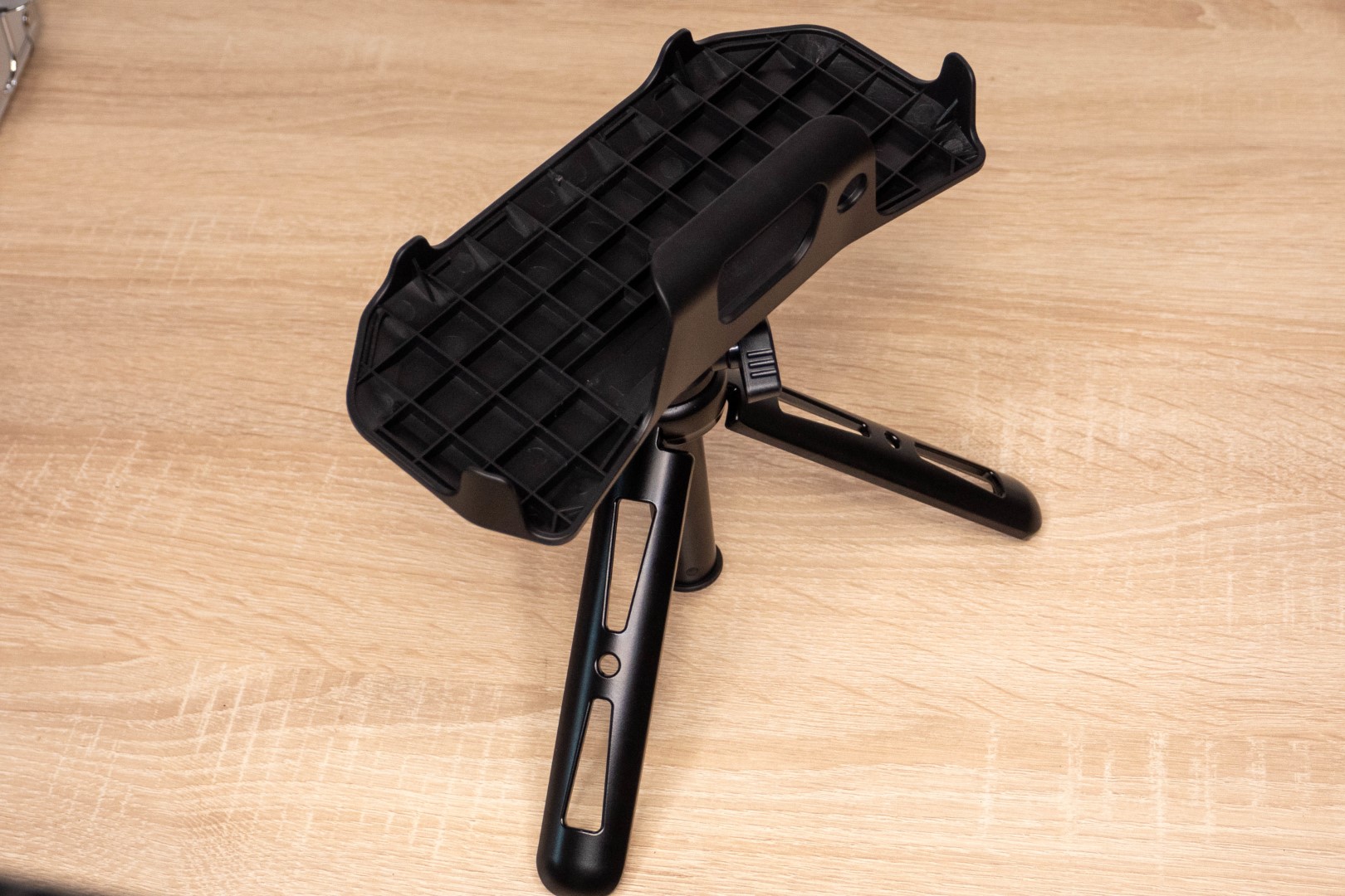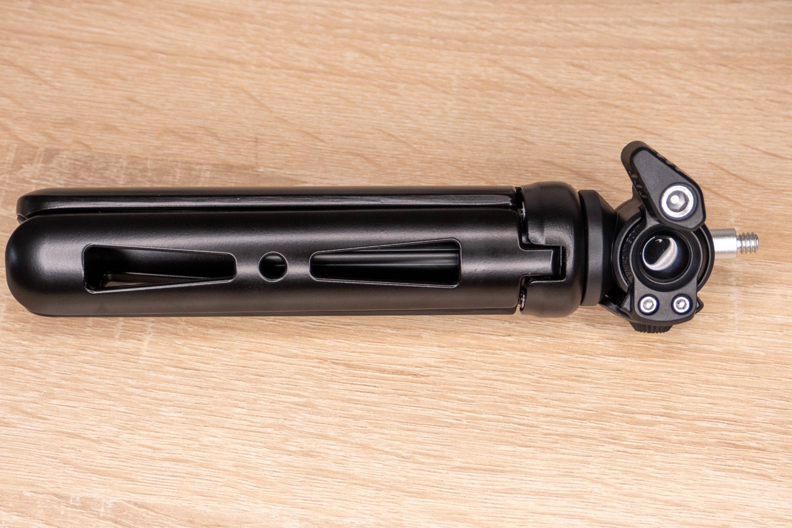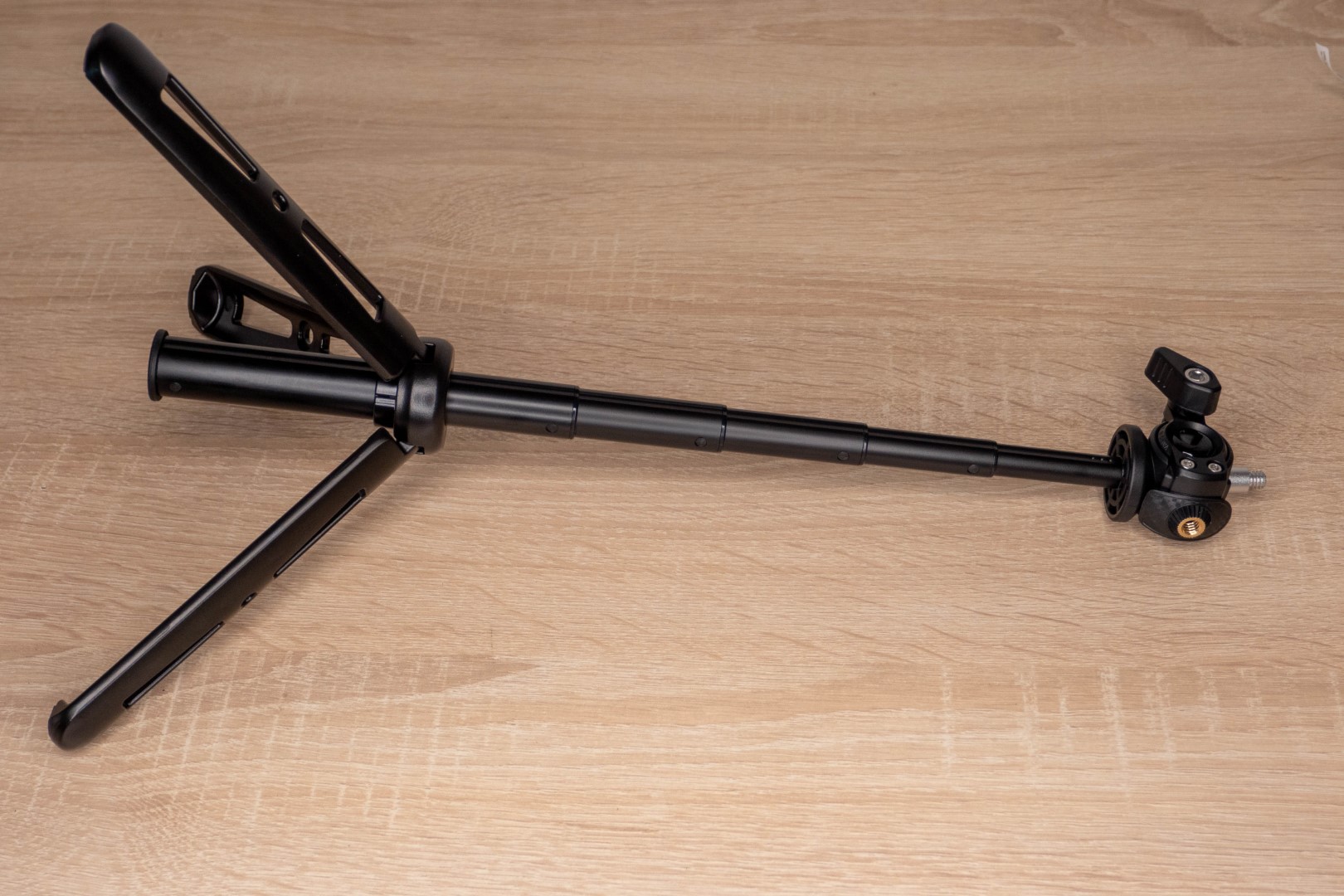В нижней секции лежал увесистый металлический штатив. Выглядит и ощущается надежно, нет люфта, прорезиненные ножки двигаются с усилием. Для поворота и наклона головы предусмотрен шарнир с фиксатором, сбоку есть стандартная резьба для фиксации дополнительного инструмента. Телескопический механизм позволяет изменять высоту от 17 до 40 сантиметров.