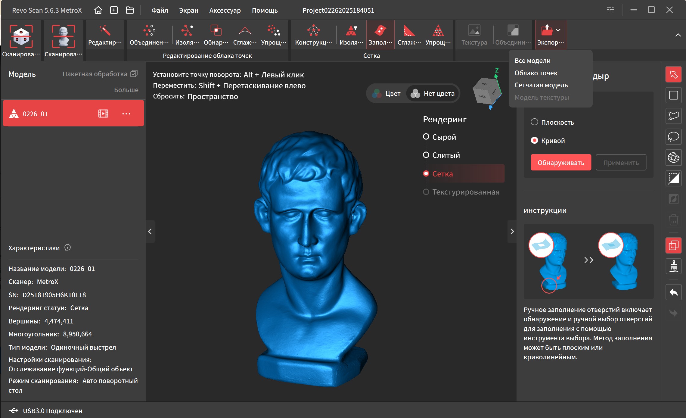 После этого можно экспортировать проект в виде облака точек или сетки. Если сохранить сетку как STL или OBJ, можно сразу закидывать полученный файл в слайсер и печатать без какой-либо обработки.