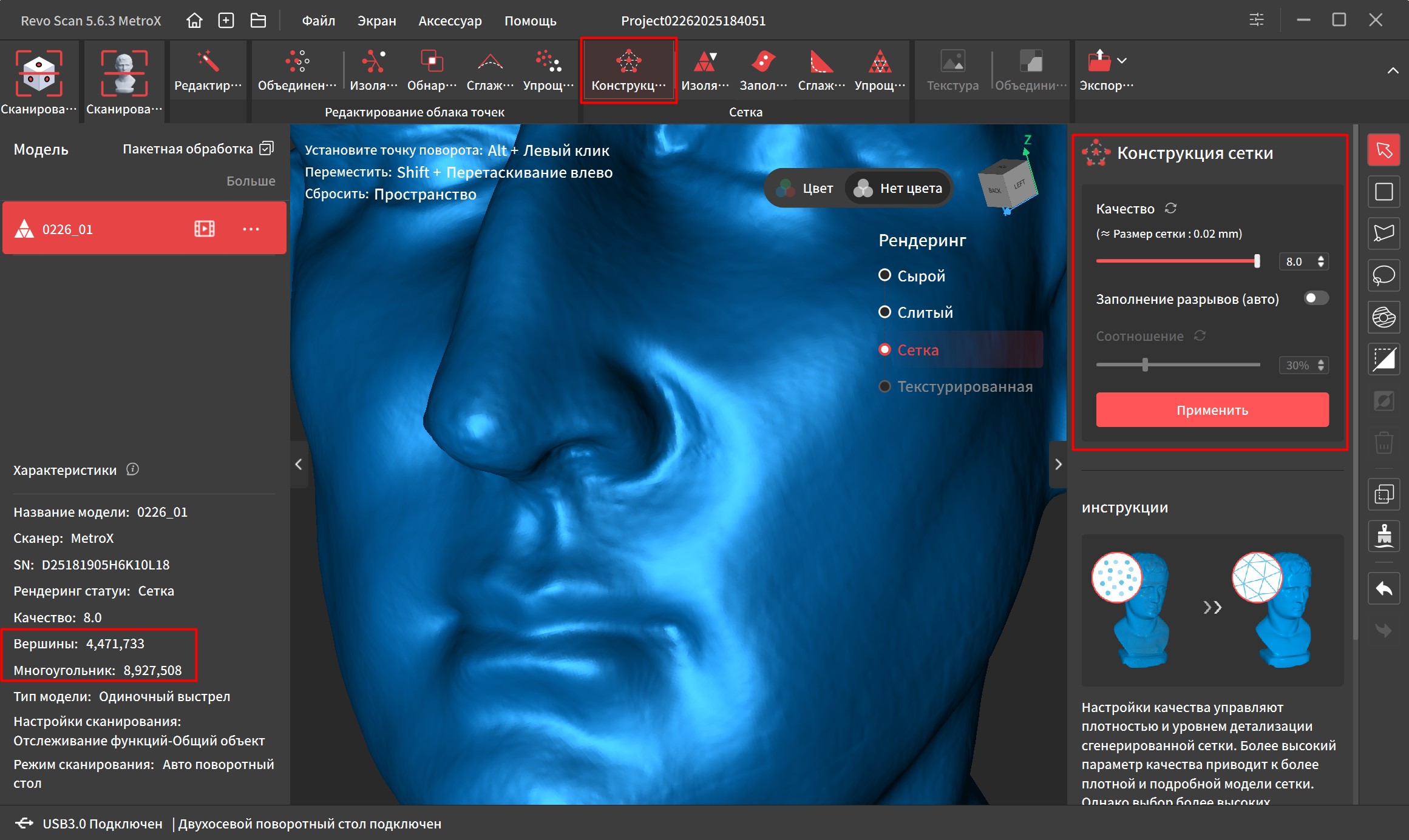 Чтобы получить замкнутую поверхность, необходимо соединить все точки в сетку. Минимальный размер можно выставить до 0.02мм. После этого снова меняются характеристики и вместо точек подсчитываются вершины и многоугольники.