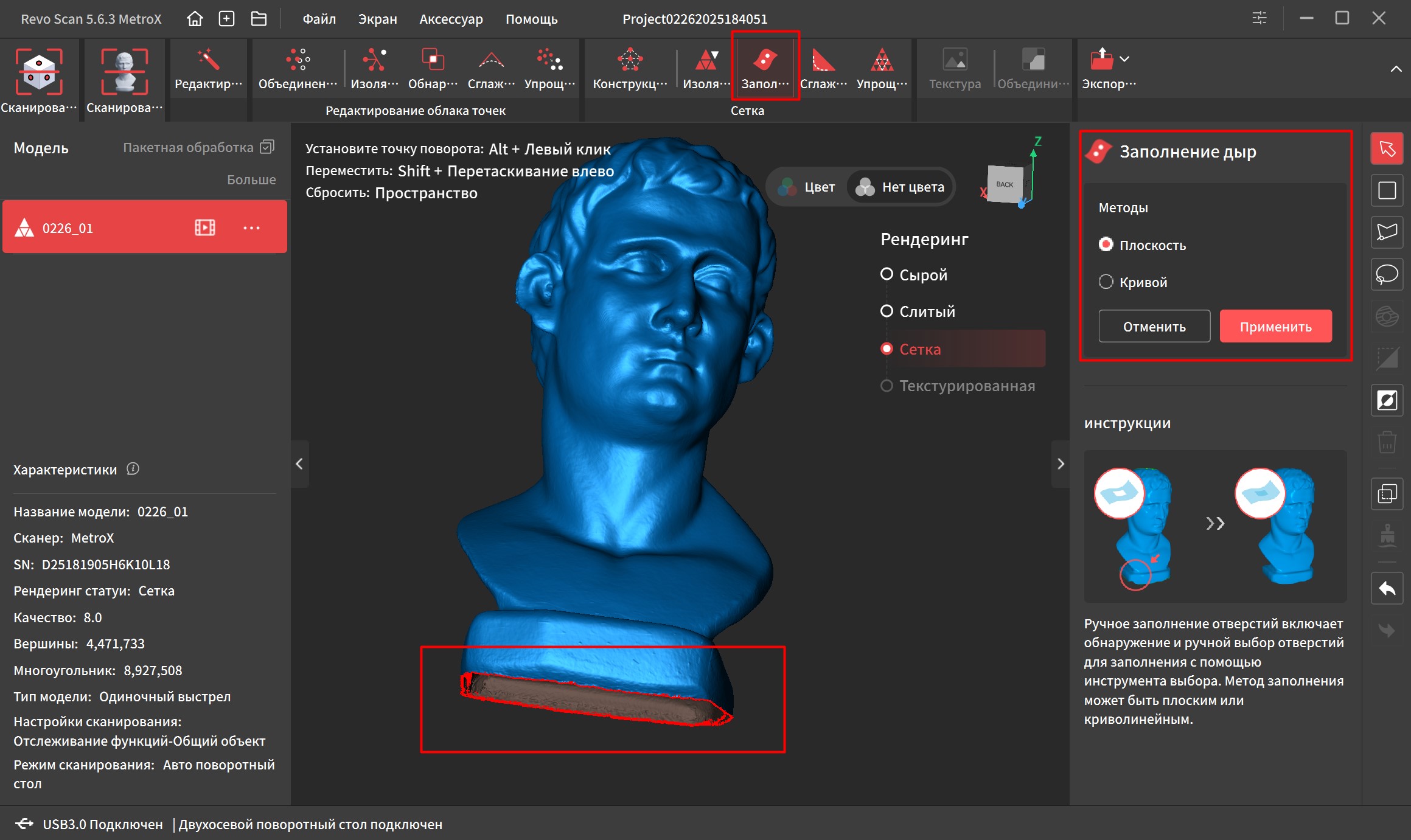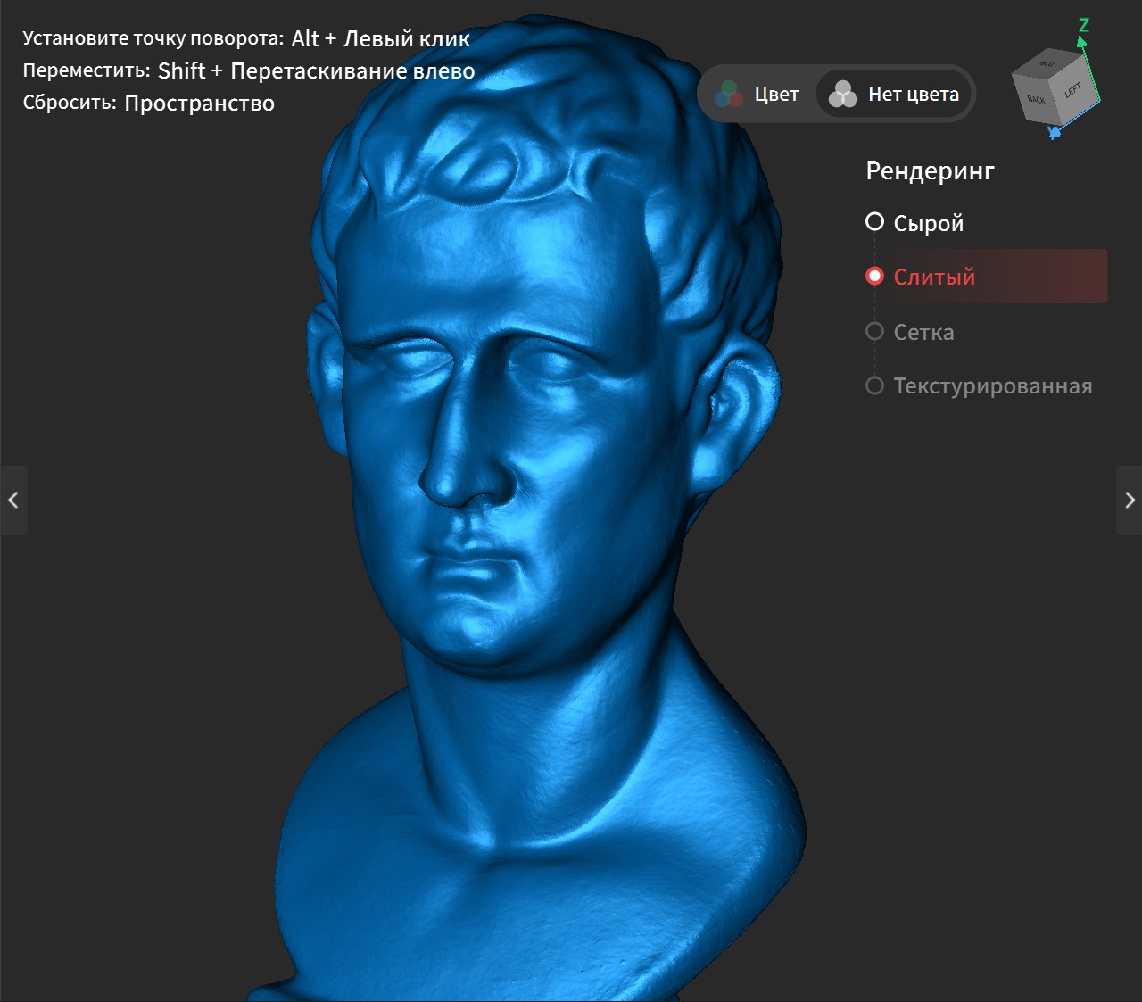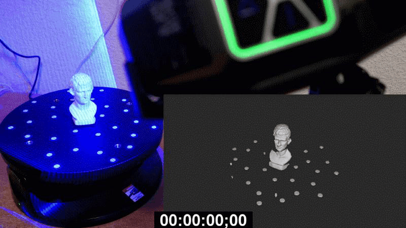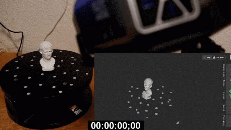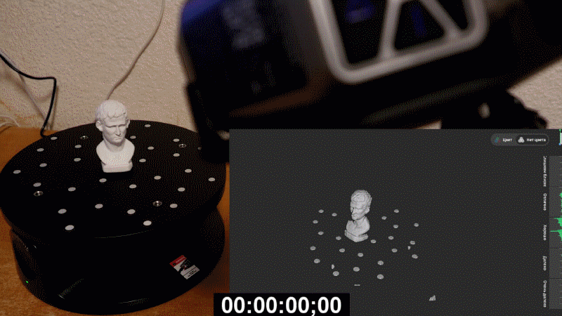 На первый взгляд ручной режим кажется удобнее автоматического. Бюст засвечивается постепенно, без разрывов со скоростью около 10 кадров в секунду, на один оборот уходит около минуты. Я наклонял стол один раз для того, чтобы захватить участки, которые не видно с начального ракурса, так что в сумме потребовалось две минуты.