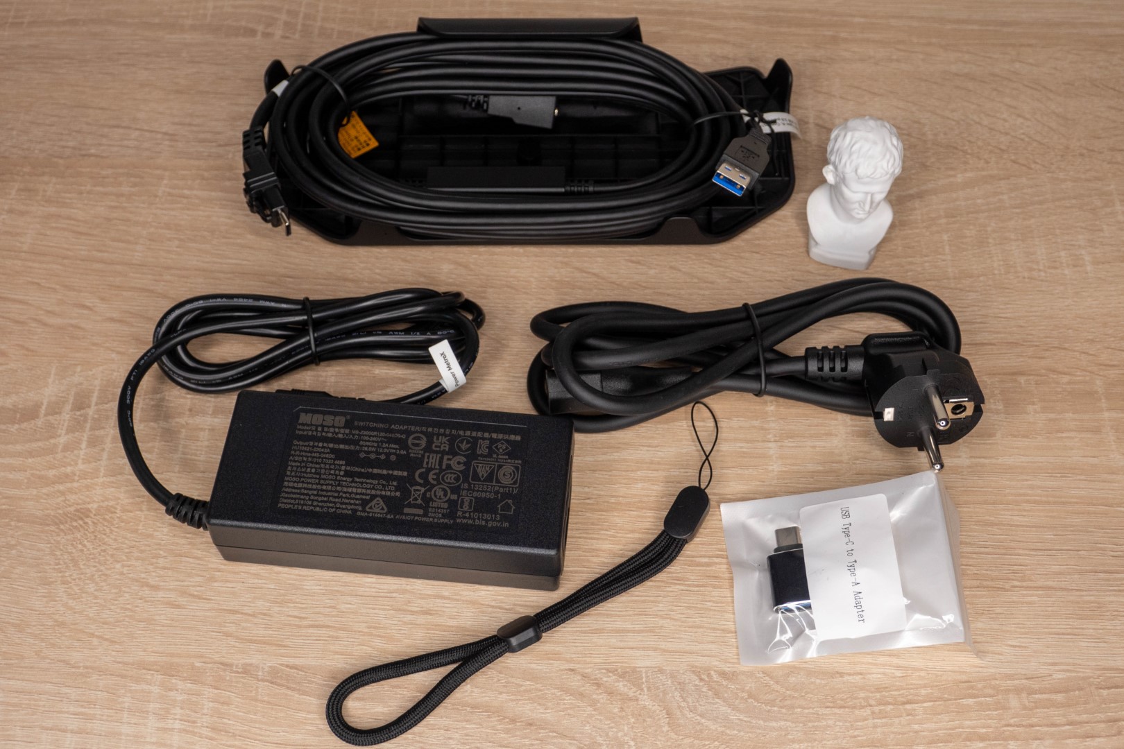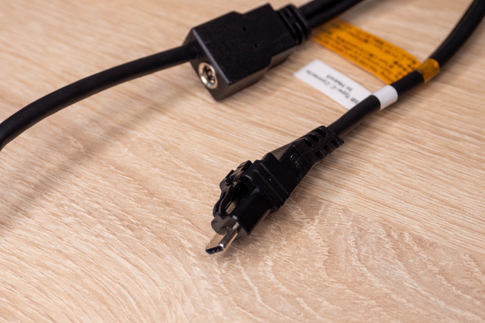 Для питания сканера используется блок питания 12В 3А, поэтому подключение осуществляется с помощью нестандартного кабеля. С одной стороны у него USB-A и 5.5мм разъем, а с другой Type-C с механическим фиксатором, напоминающим те, что используются в сетевых или телефонных кабелях.