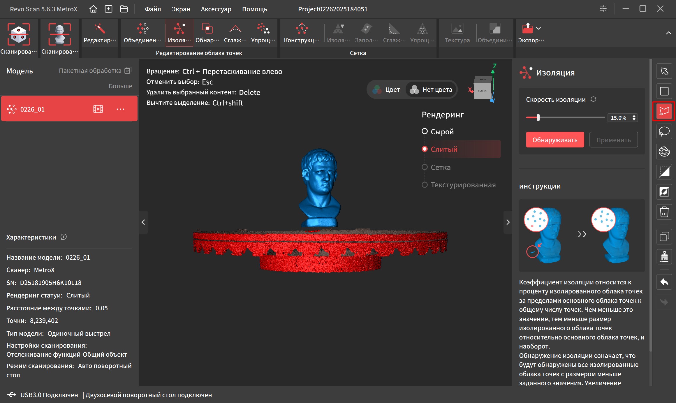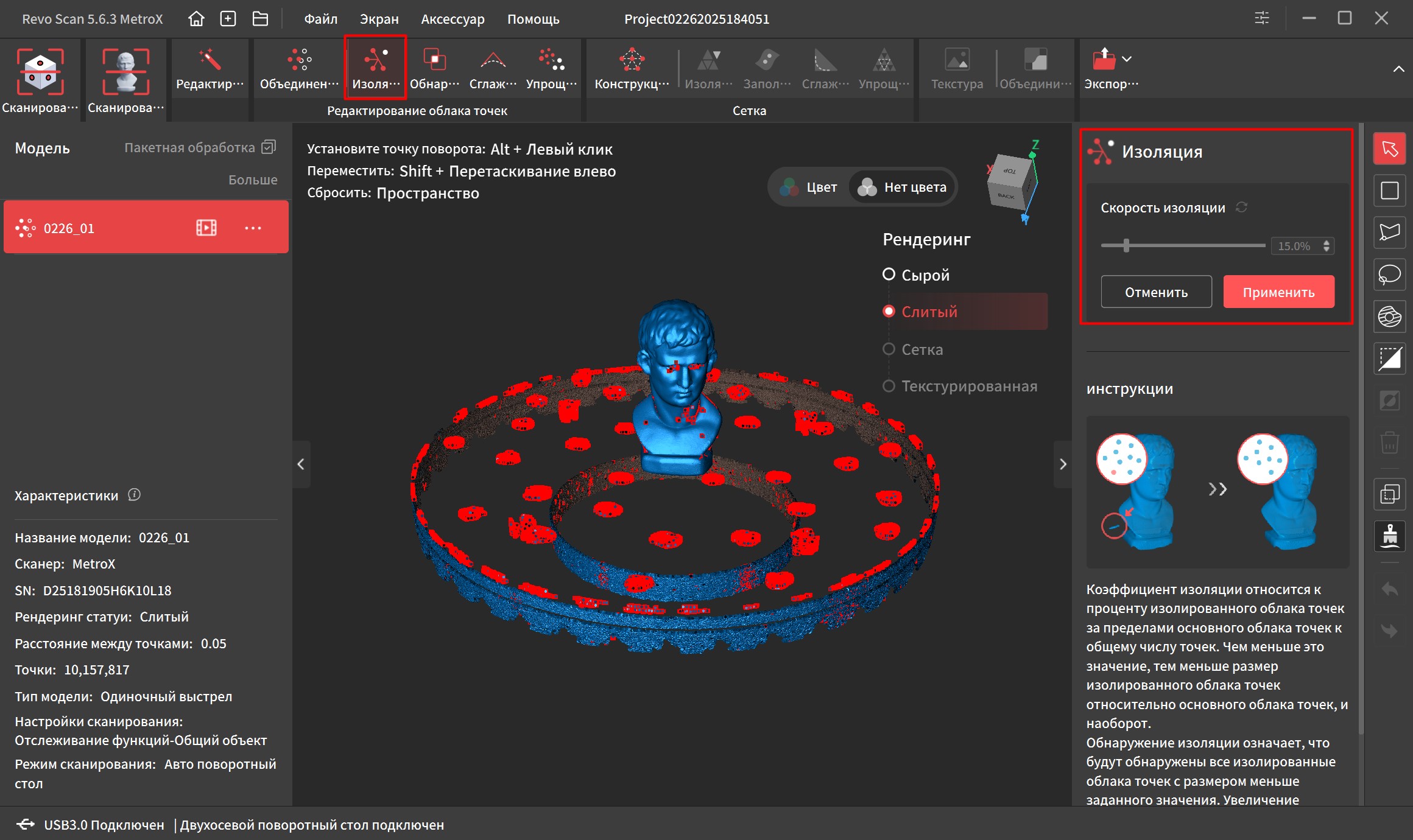 С помощью изоляции можно убрать «мусор» который находится в стороне от основного скопления. Обычно удаляются следы от маркеров и небольшие точки, висящие в воздухе если в процессе сканирования что-то давало блики. Что-то более массивное нужно будет убрать вручную, благо инструментов для этого хватает.