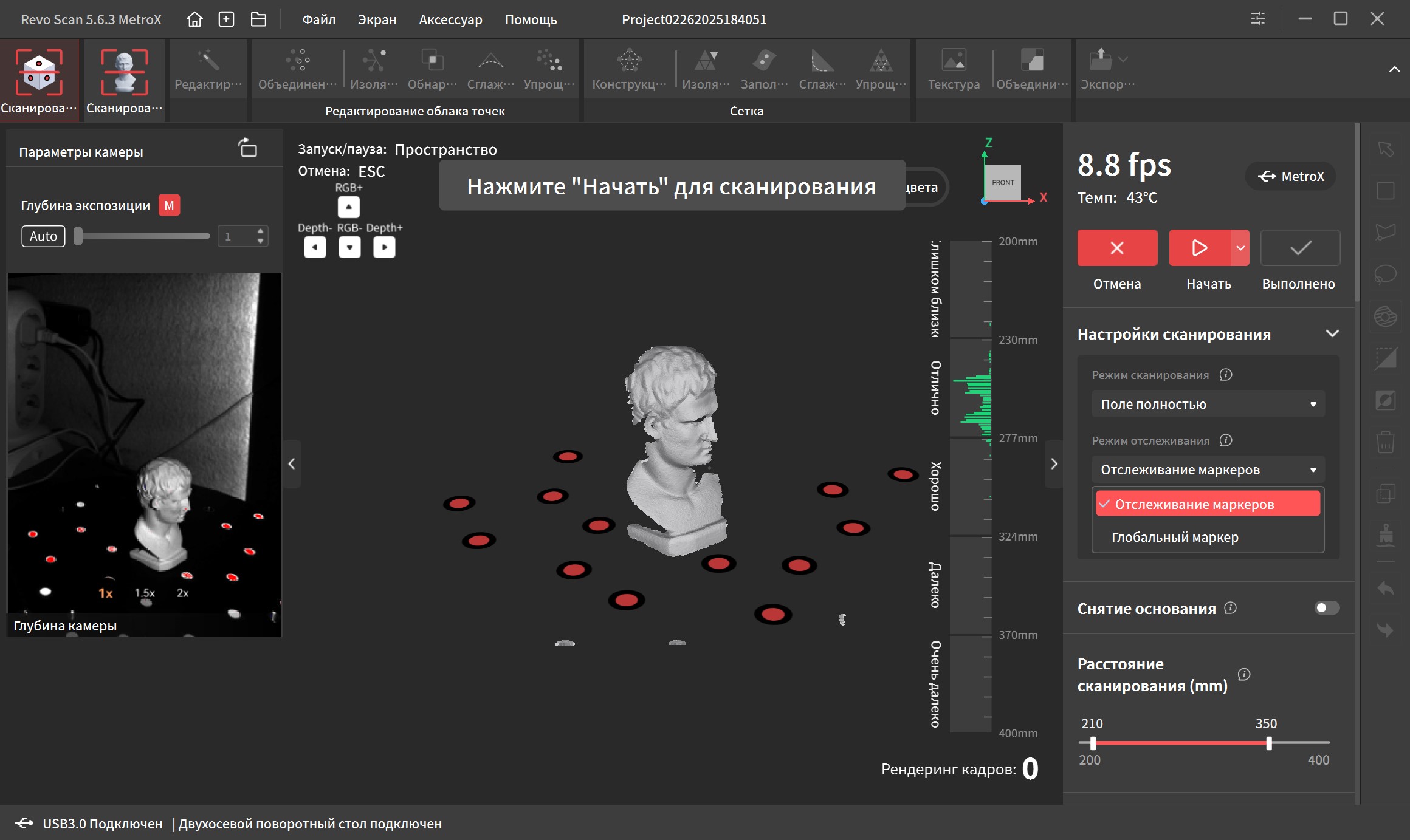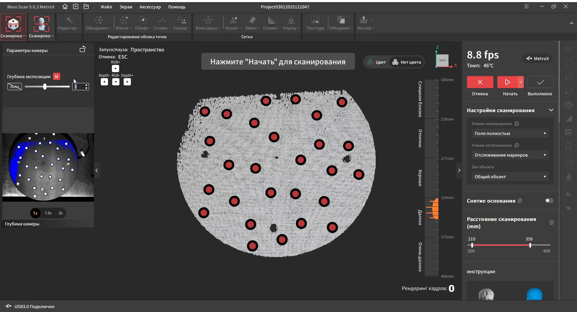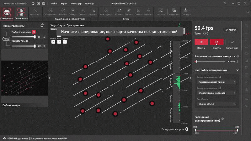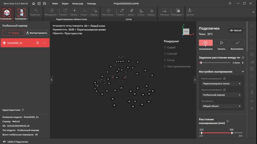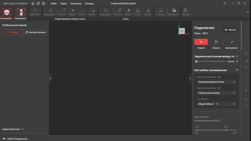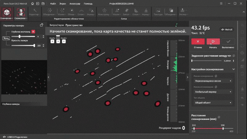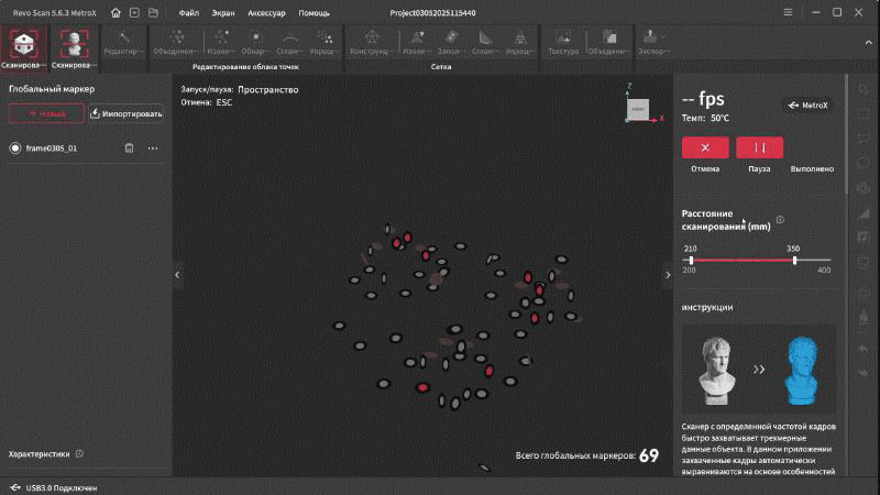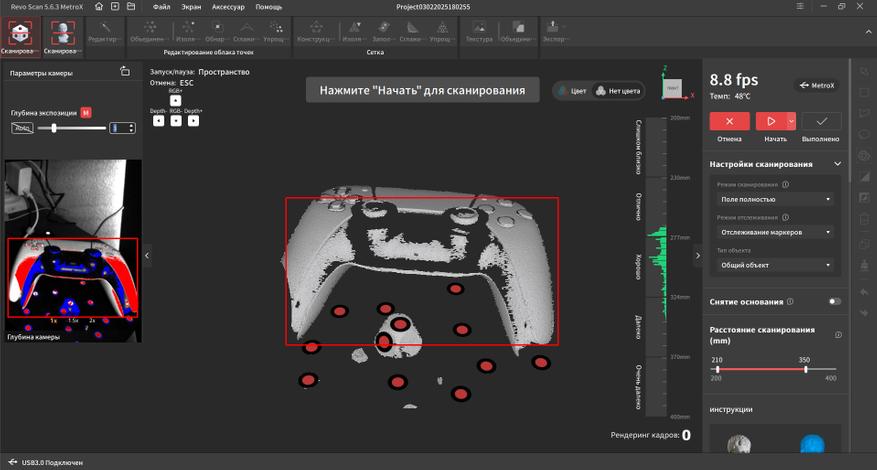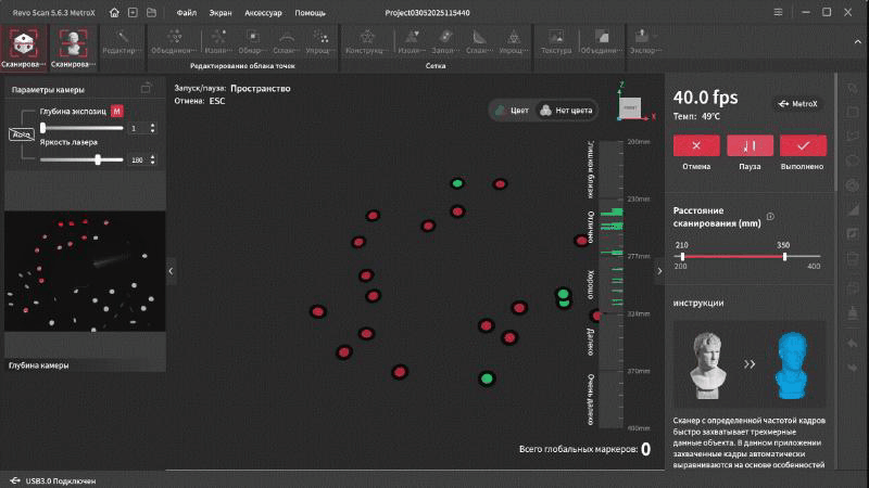 Интерфейс переведен на русский язык и довольно прост в освоении. В верхней части окна находятся основные вкладки, справа дополнительные параметры и инструменты. Самая первая вкладка подразумевает работу с маркерами. Тут можно выбрать один из четырех режимов работы, режим отслеживания, тип объекта, шаг отрисовки, а так же расстояние фокусировки. Это позволяет отсеять лишний шум на заднем плане при сканировании небольших объектов.