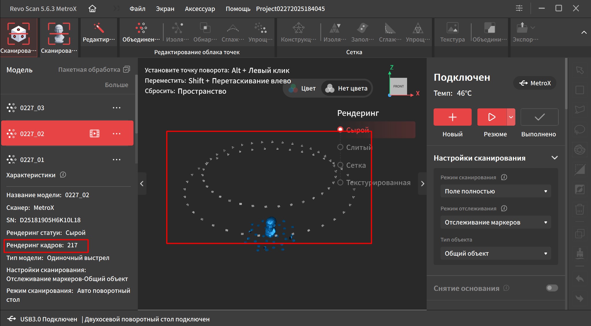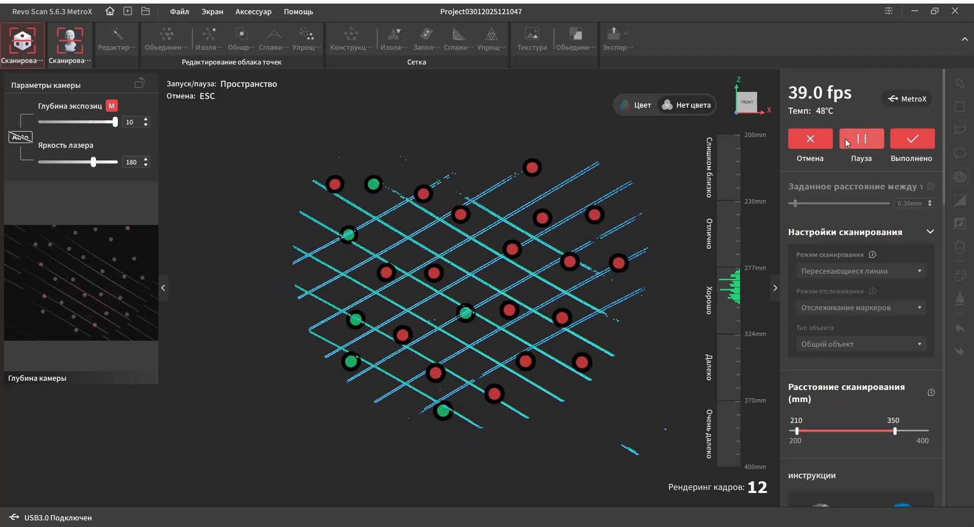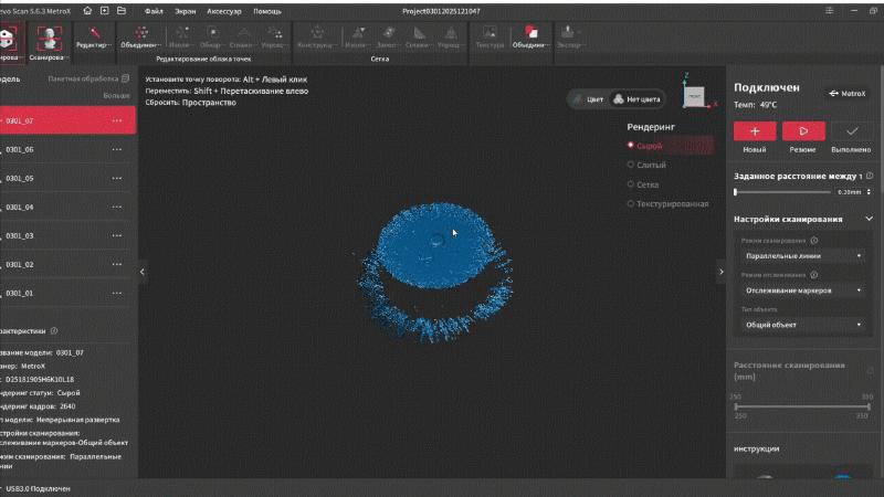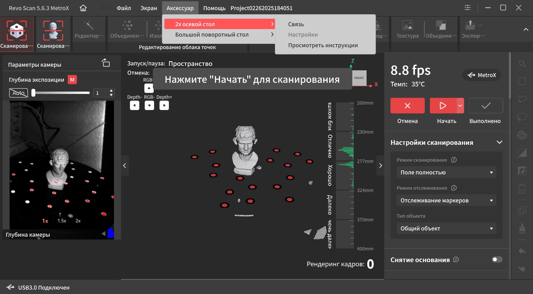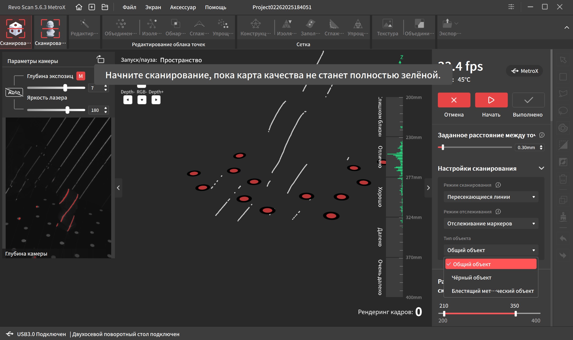Интерфейс переведен на русский язык и довольно прост в освоении. В верхней части окна находятся основные вкладки, справа дополнительные параметры и инструменты. Самая первая вкладка подразумевает работу с маркерами. Тут можно выбрать один из четырех режимов работы, режим отслеживания, тип объекта, шаг отрисовки, а так же расстояние фокусировки. Это позволяет отсеять лишний шум на заднем плане при сканировании небольших объектов.