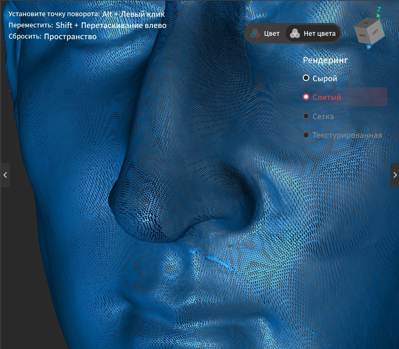 Казалось бы, качество уже неплохое, местами даже видна фактура поверхности, но это по прежнему просто скопление точек, просто довольно плотное. Это становится видно после увеличения.