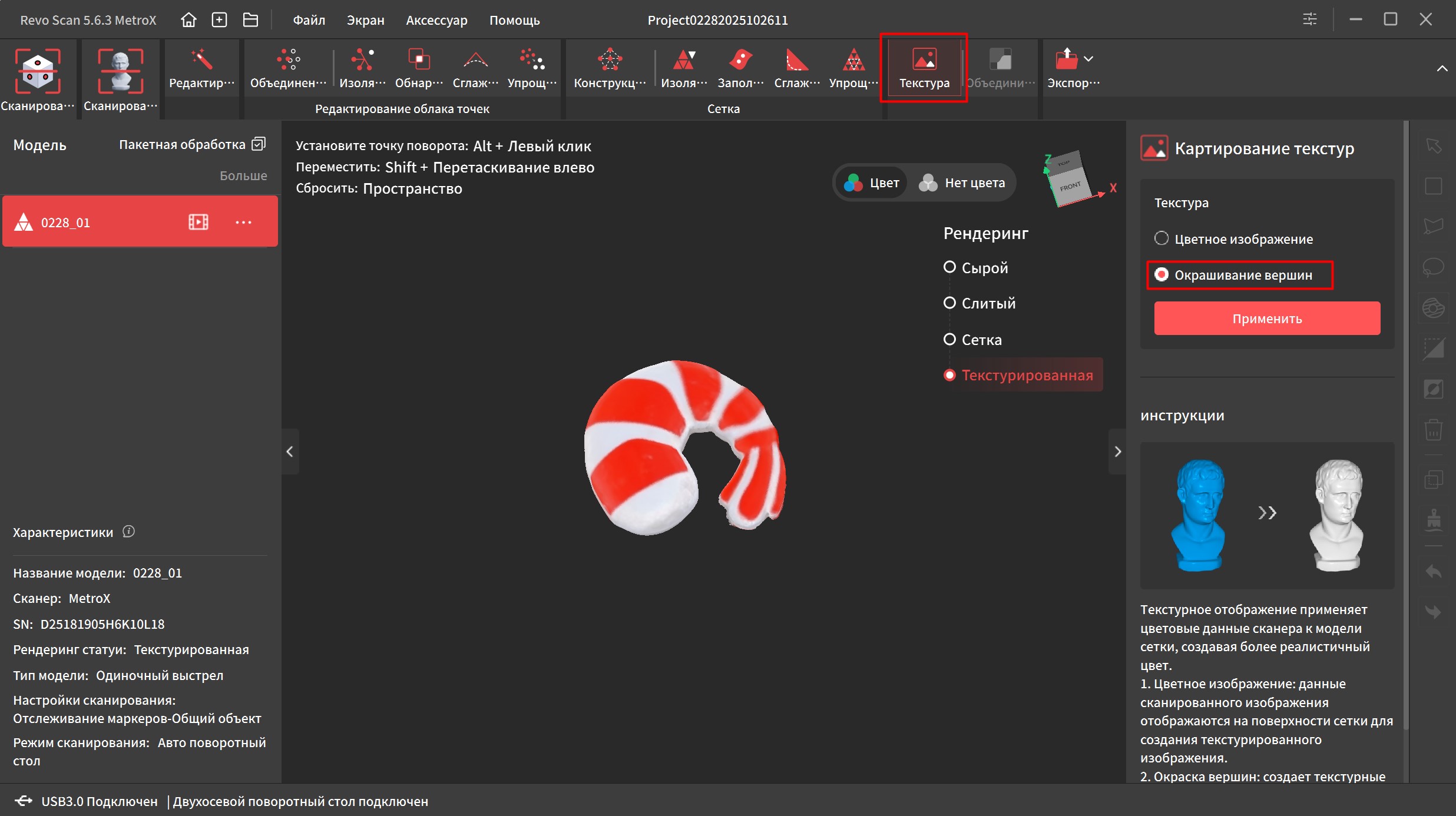 Чтобы «окрасить» объект, достаточно включить опцию «Цветное сканирование». При экспорте текстуру можно будет сохранить отдельно. Есть два варианта наложения — «Окрашивание вершин» и «Цветное изображение». В первом случае детализация получается хуже, но и дефекты поверхности и блики видно меньше.