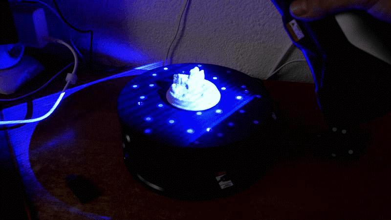 В автоматическом режиме стол вращается ступенчато, а сканер делает три снимка с разной экспозицией во время остановки. Итого на два прохода под разным углом потребовалось 6 минут, что втрое больше, чем было до этого.