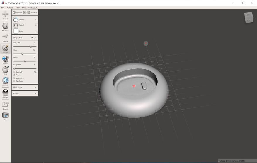 Нужно было на этапе обработки сглаживающей кистью убрать отверстия винтов и клапана для заправки, так что пришлось немного почистить результат в мешмиксере.