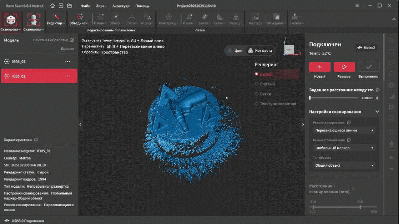 В марте вышло обновление Revo Scan 5 MetroX и приложение научилось нормально использовать GPU, что заметно увеличило производительность в режиме перекрестных и параллельных лазерных линий. На анимации ниже сканирование в реальном времени, гифка даже чуть более дерганная получилась, чем видео.
