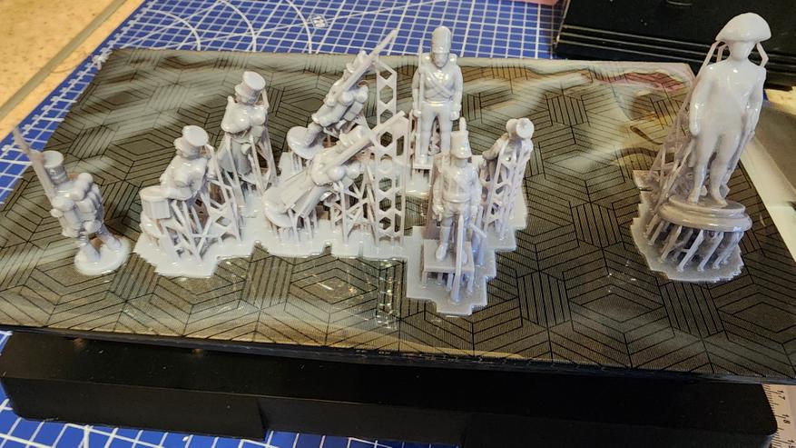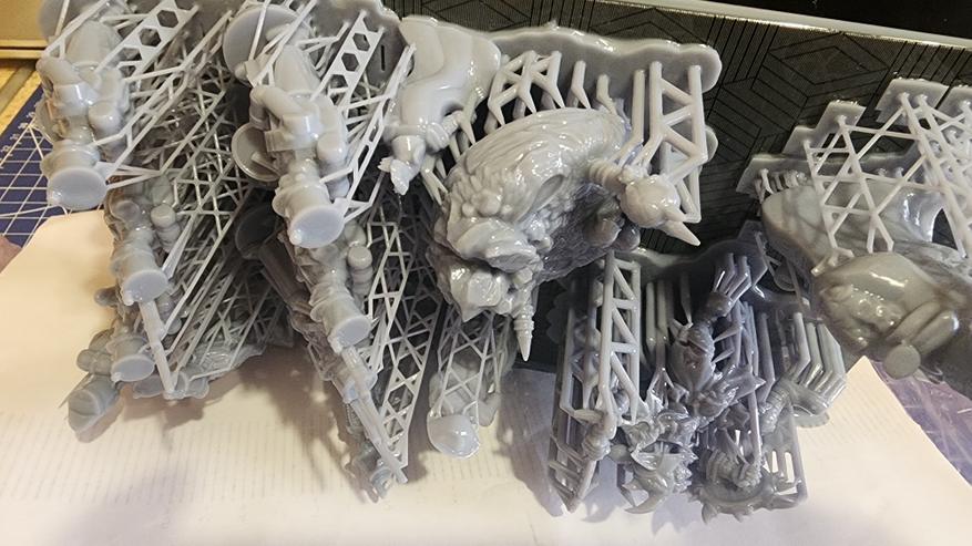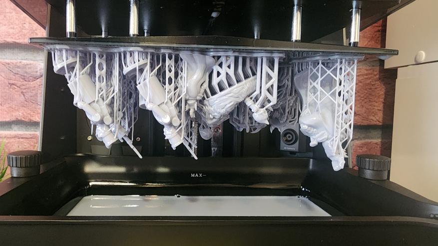 - Просушиваем модели от остатков спирта/воды, подвергаем дозасветки. Параметры засветки сильно зависят от типа смолы и сложности/размеров модели. Еще одна ошибка при дозасветке — перезасветка/неравномерная засветка. В этом случае спасает поворотный столик или, опять же, комплекты оборудования, такие как ELEGOO MERCURY XS.