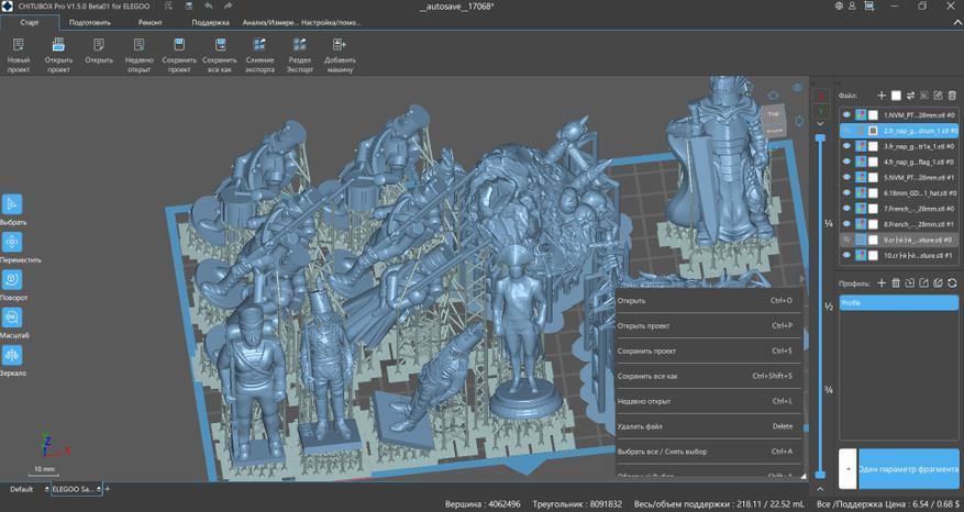 Какие-то модели из свободного доступа, какие-то были созданы на заказ, что-то моделировал сам. В любом случае, для печати потребуются файлы в формате stl/obj, а также слайсер для подготовки файлов печати. Я использую Chitubox с профилем Elegoo и стандартным настройками для печати оригинальной смолой. Что важно при подготовке файлов — я увеличил время «отдыха после отвода» на 20% (1200 мс вместо 1000) и размещаю модели под небольшим углом.