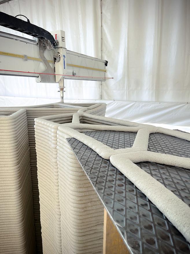 Процесс печати осуществлялся с помощью манипулятора на основе крана с центральной мачтой. Стрела оборудования выдвигается наружу и несёт экструдер, который послойно выдавливает материал, формируя стены снизу вверх в соответствии с цифровой моделью. Система позволяет регулировать длину стрелы и площадь печати в зависимости от размеров объекта. Окна, двери и крыша были установлены традиционными методами после завершения печати основной конструкции.