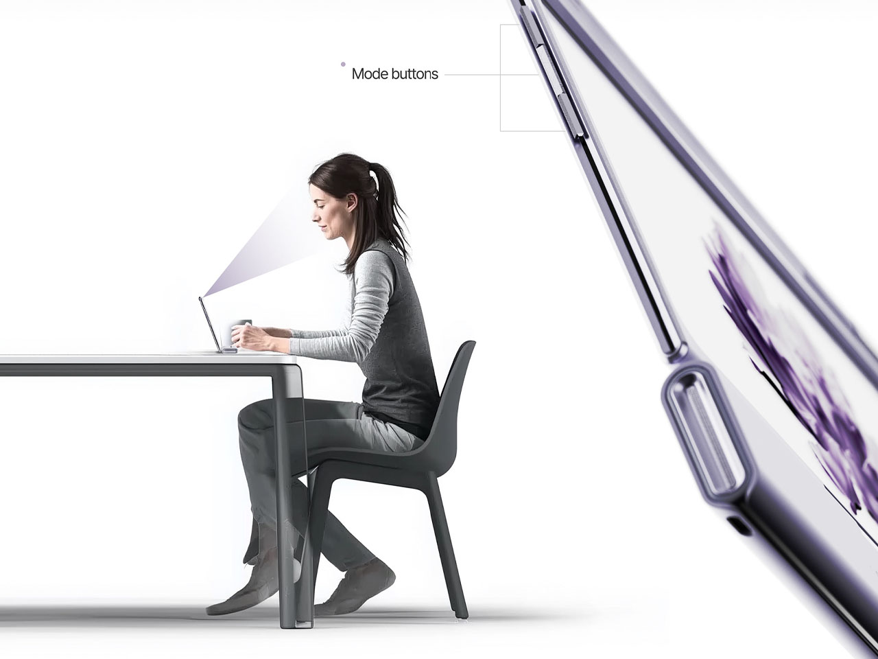 В режиме «Объект» устройство генерирует фоновую графику, которая адаптируется к окружающему интерьеру. Система анализирует цветовую гамму помещения и настраивает визуальные элементы экрана для гармоничного сочетания с обстановкой. Дисплей доступен в трёх цветовых решениях: фиолетовом, бежевом и стальном сером.