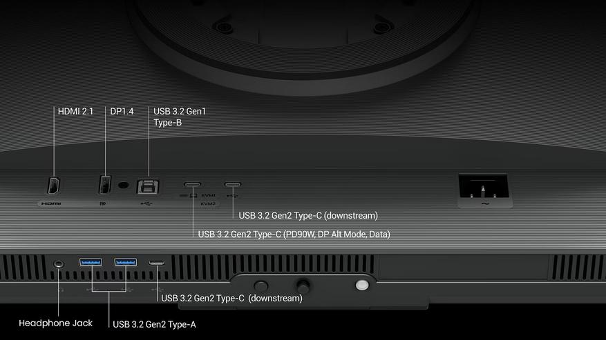 Для передачи данных и питания внешних устройств используется интерфейс USB-C с мощностью до 90 Вт. В монитор встроен KVM-переключатель для управления двумя компьютерами с помощью одного набора периферии. На корпусе расположена отдельная кнопка для переключения между профилями изображения и настройки параметров дисплея.