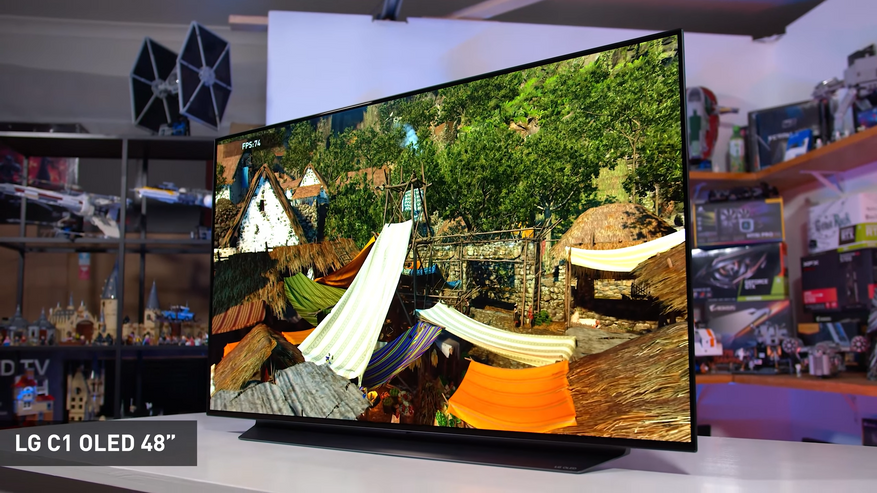 Второй монитор — ещё более дорогой Asus Rog Swift PG32UQX с диагональю 32 дюйма, разрешением 4K и частотой обновления 144 Гц. Третий монитор (а точнее уже телевизор) — это LG C1 OLED с диагональю 48 дюймов и частотой 120 Гц. Он существенно дешевле любого из двух вышеуказанных вариантов, а технология OLED отлично справляется с HDR, демонстрируя при этом недостижимую для LCD скорость отклика.