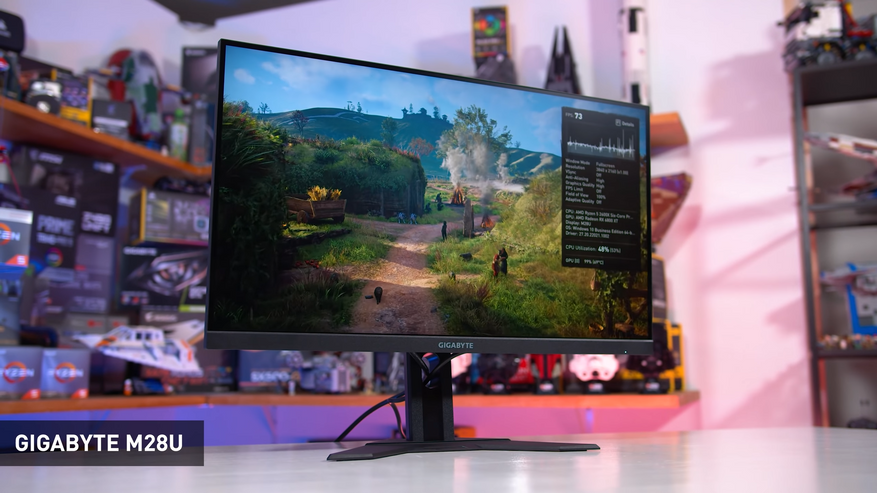 Gigabyte M28U стал лучшим бюджетным выбором среди 4K-мониторов. Здесь диагональ 28 дюймов, частота 144 Гц. M28U демонстрирует даже лучшее время отклика, чем вышеупомянутый MSI Optix, но не может конкурировать с ним в цветопередаче.