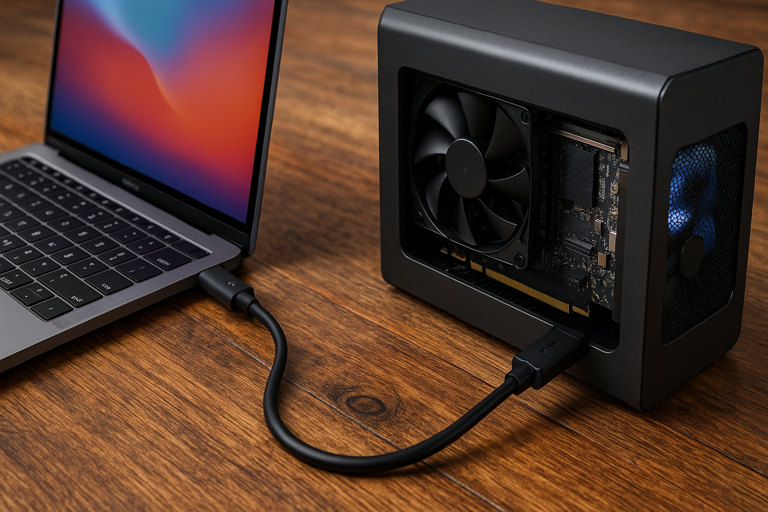 Суть проста: вы используете внешний бокс с полноценной настольной видеокартой, который подключается к ноутбуку через скоростной интерфейс (чаще всего Thunderbolt). В результате ноутбук начинает работать с мощным дискретным GPU почти как полноценный стационарный компьютер.