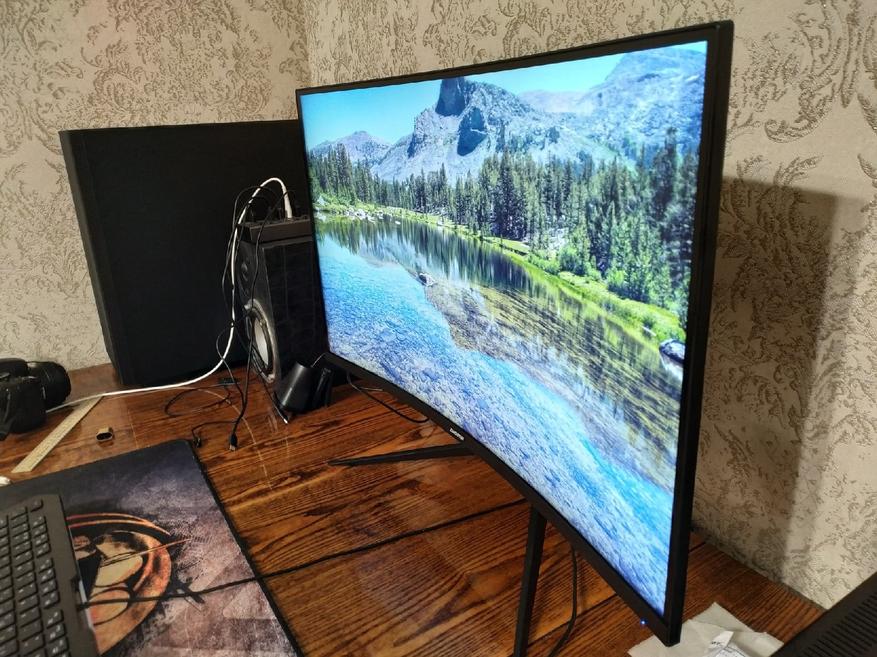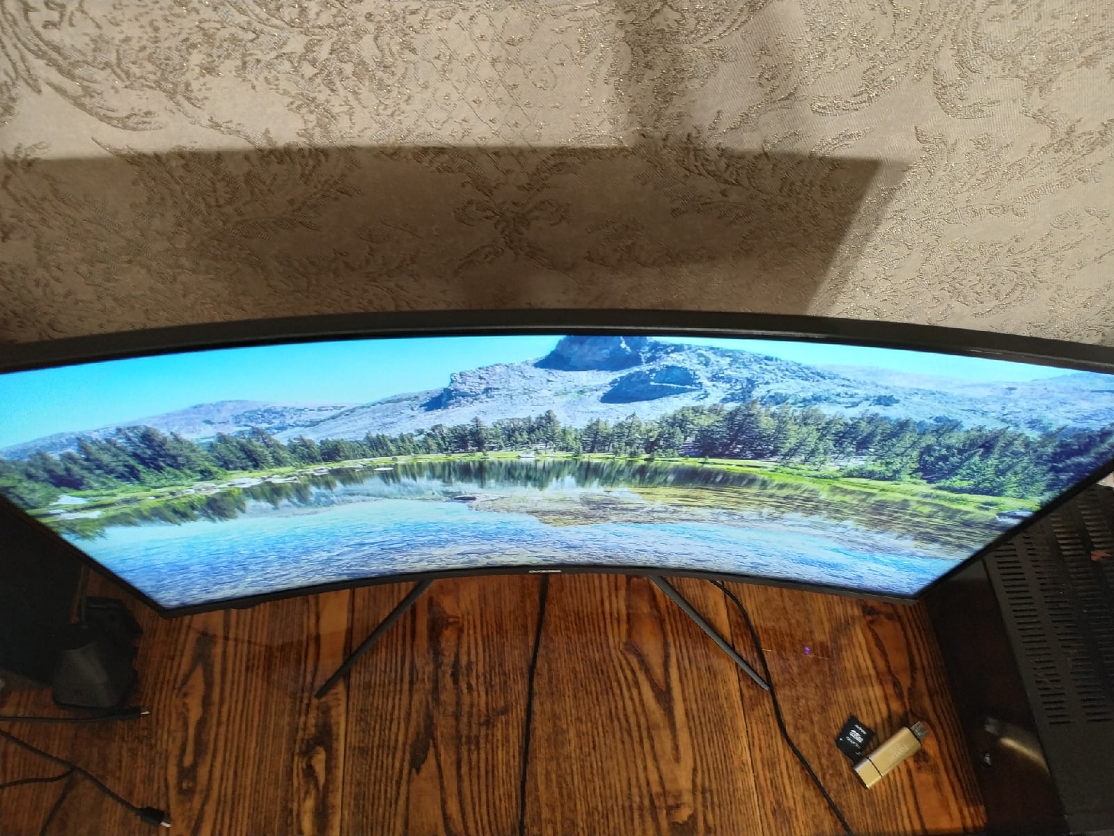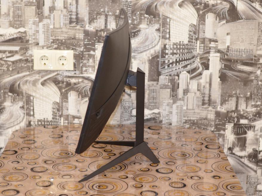 Монитор огромный, изогнутый с отличными углами наклона, которых вполне хватает для повседневных нужд. Немного расстраивает наличие лишнего обрамления, теряется вся суть тонких рамок, но это компенсируется яркими и сочными цветами картинки. Благодаря довольно большим углам обзора монитор можно использовать как для работы, так и для просмотра фильмов сидя на диване. Глаза от него не устают.