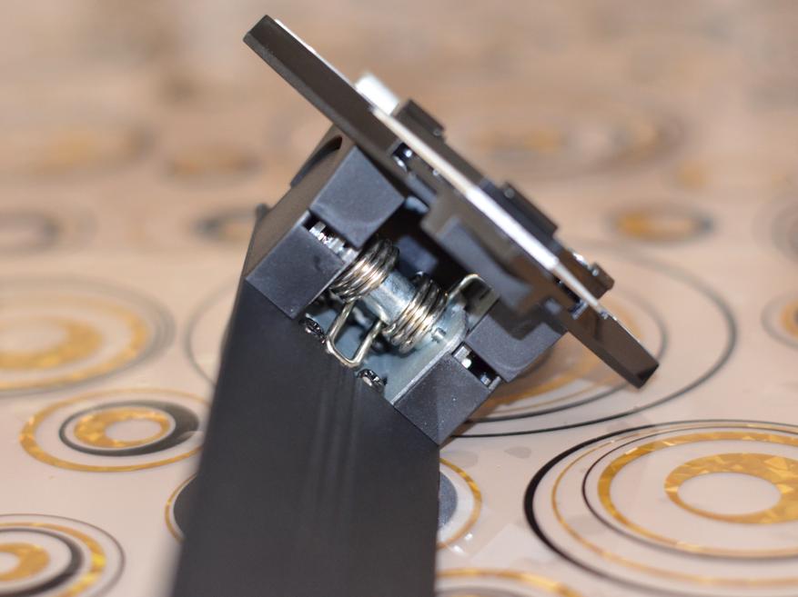 Корпус состоит из стойки, основание которой прикручивается к нижней части подставки, а верхняя часть предназначена для крепления к монитору. Для крепления к монитору необходимо вставить металлические выступы в корпус монитора и нажать вниз, пластиковый замок защелкнется. Демонтаж производится в обратном порядке, пластиковая часть отодвигается вверх и стойку можно снимать. Для возможности регулировки угла наклона монитора тут предусмотрен поворотный механизм, который оснащен металлической пружиной.