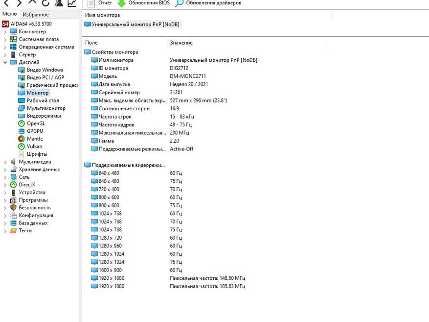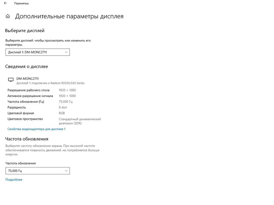 Параметры монитора по информации от Windows10. Заявка на 75Гц подтверждена.
