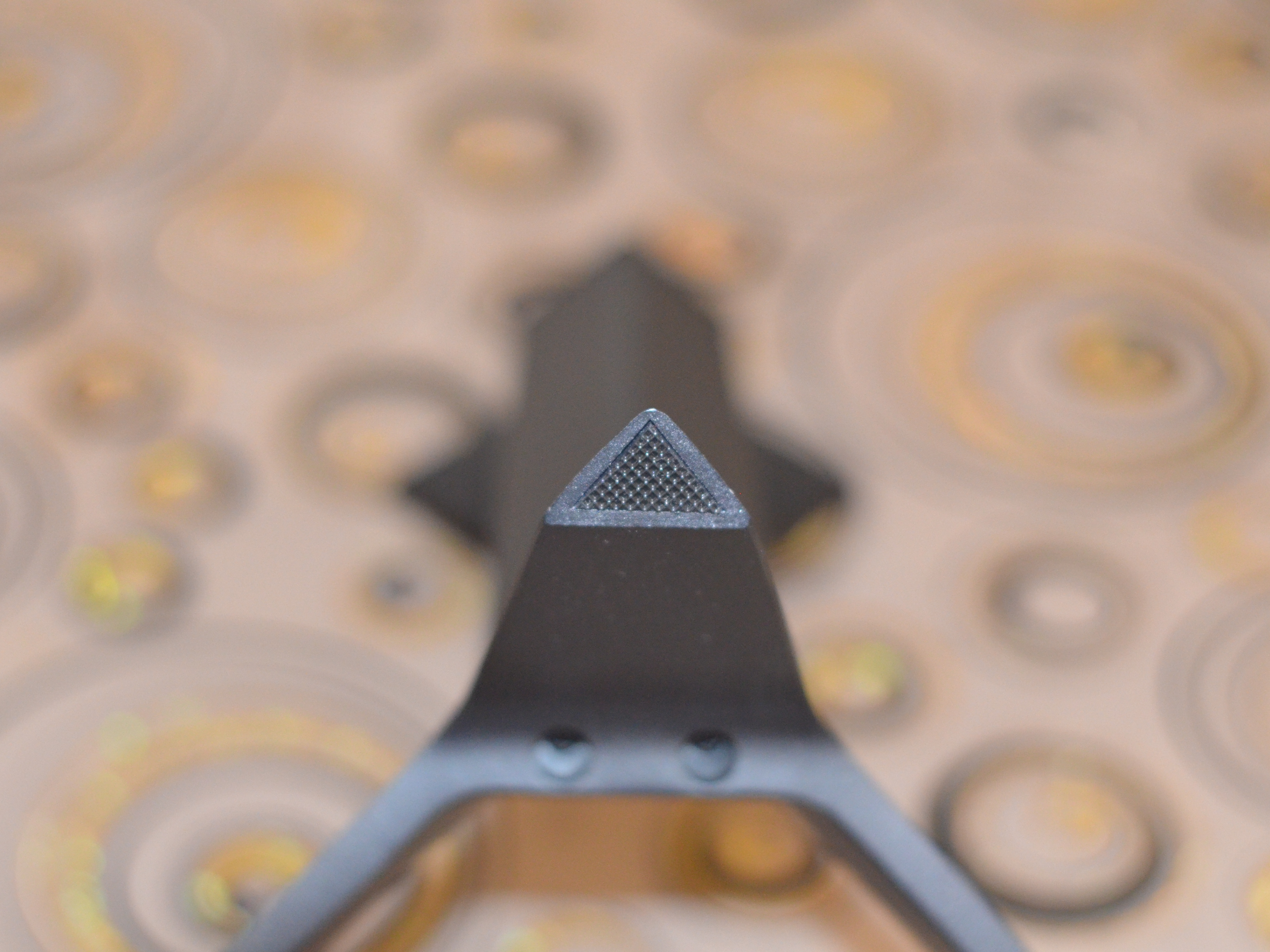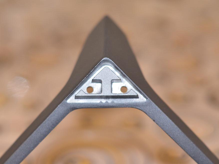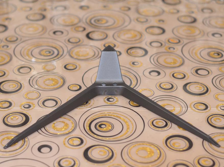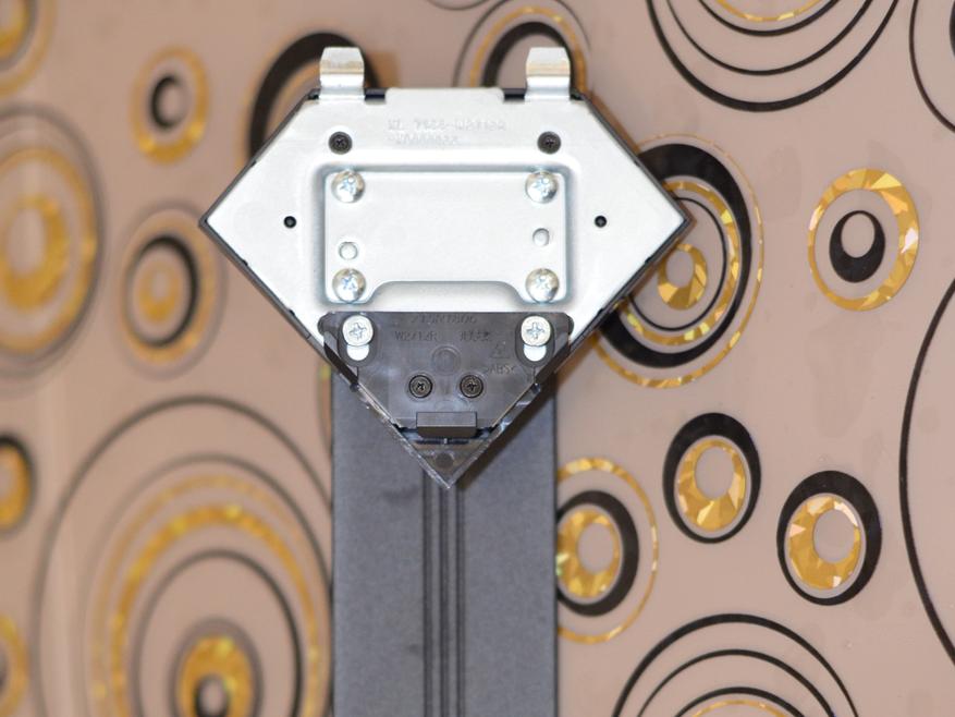 Подставка состоит из двух частей. Основание металлическое покрашено в серебро. В верхней части имеется два отверстия для винтов, которые удерживают корпус стойки на основании. На нижней части ножек установлены резиновые накладки, которые предотвращают скольжение по поверхности.