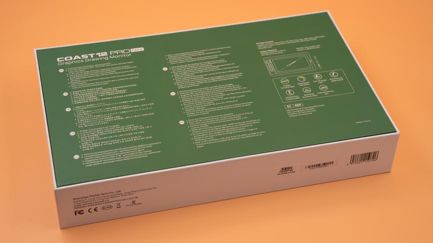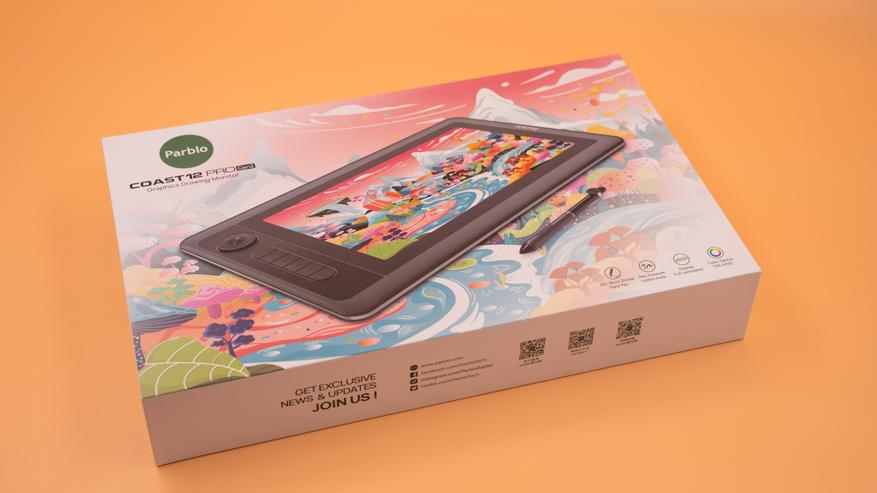 Parblo Coast12 Pro Gen 2 поставляется в качественной упаковке. Устройство упаковано в картонную коробку с яркой и привлекательной полиграфией. На лицевой стороне упаковки изображен сам графический планшет, что позволяет сразу оценить его дизайн и внешний вид. На тыльной стороне коробки производитель разместил подробное описание ключевых технических характеристик Parblo Coast12 Pro Gen 2, что дает возможность ознакомиться с основными параметрами еще до вскрытия упаковки.