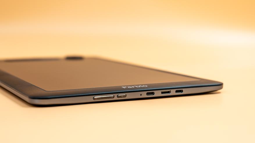 На правой боковой грани компактно размещены все необходимые порты: питание, регулировка яркости, USB-C с поддержкой питания, mini-HDMI и видео-USB-C. Каждый разъем имеет четкое обозначение прямо на корпусе под областью крепления пера.