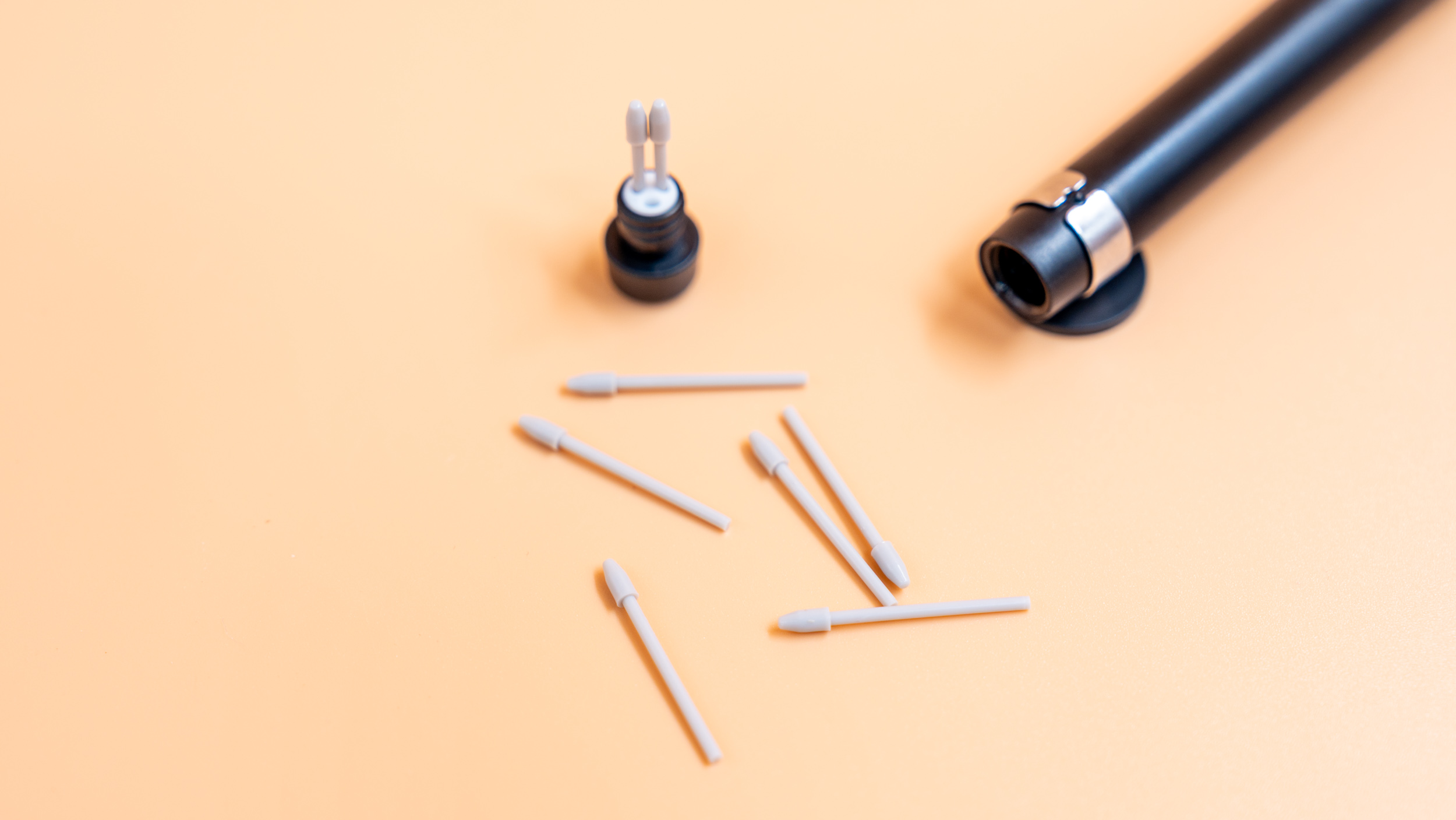 Съемный колпачок стилуса скрывает отсек с тремя запасными наконечниками, а серебряное кольцо на заднем торце служит удобным инструментом для их замены.