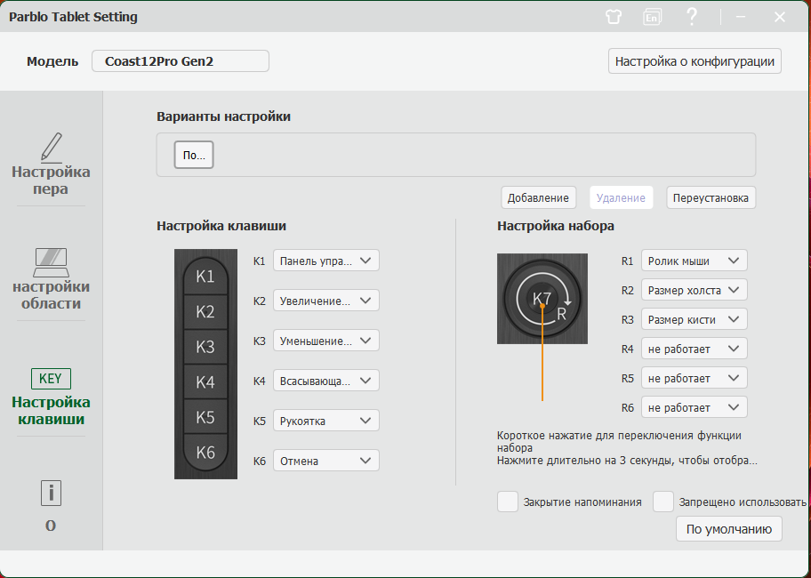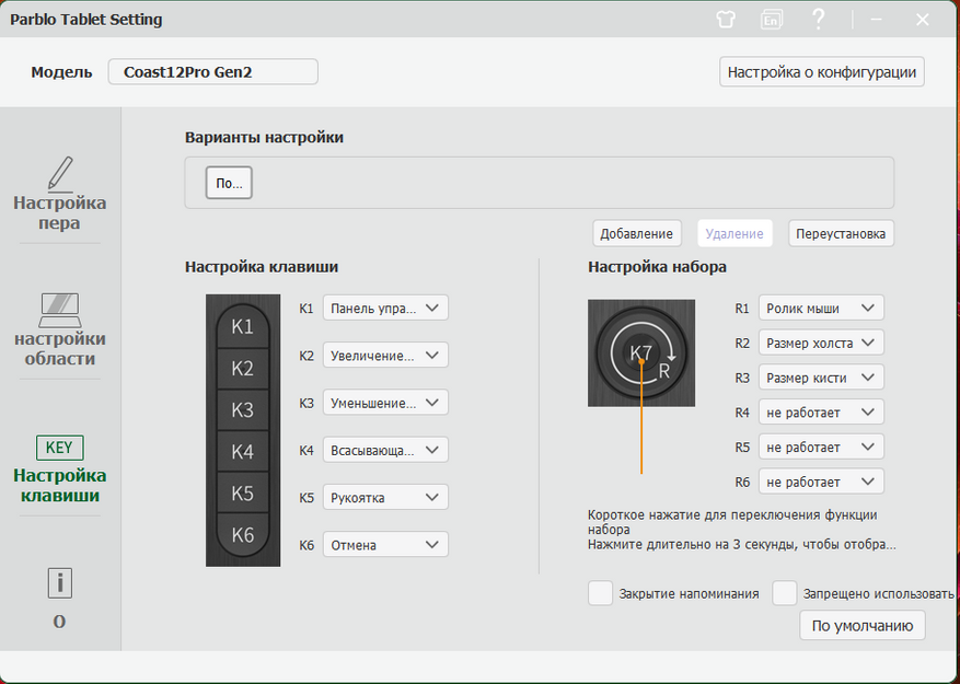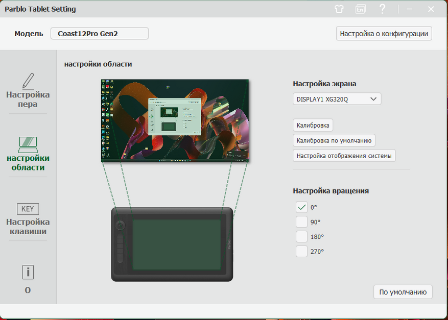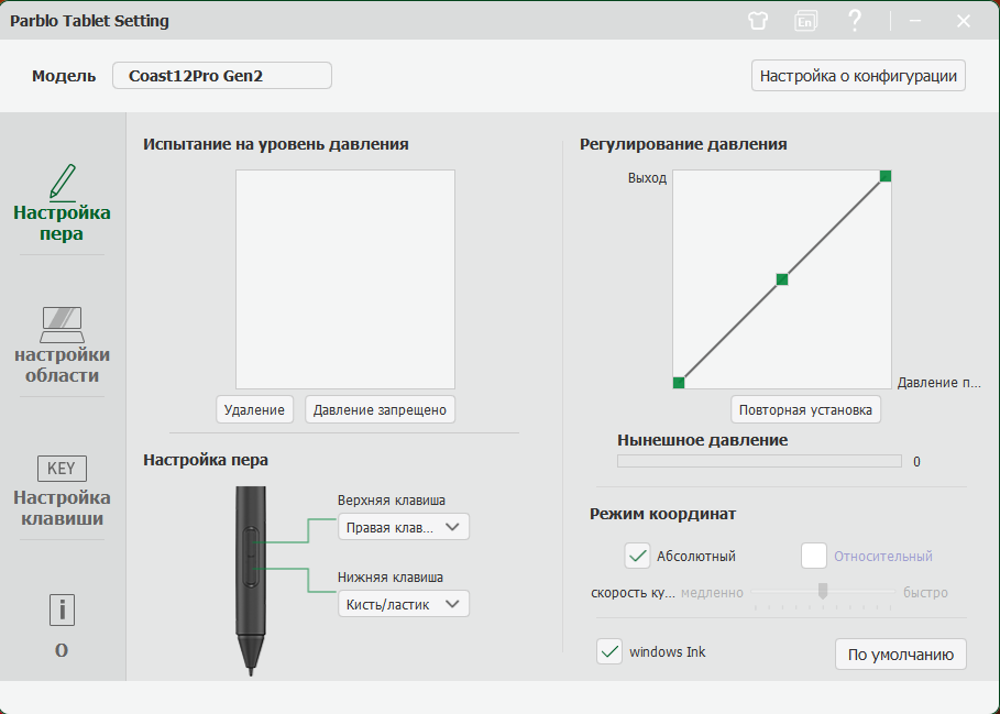 Для тонкой настройки графического монитора Parblo Coast12 Pro Gen 2 и стилуса Parblo S01 необходимо установить специализированное программное обеспечение на компьютер под управлением Windows или macOS. Программа включает в себя несколько вкладок, позволяющих детально отрегулировать работу устройства.