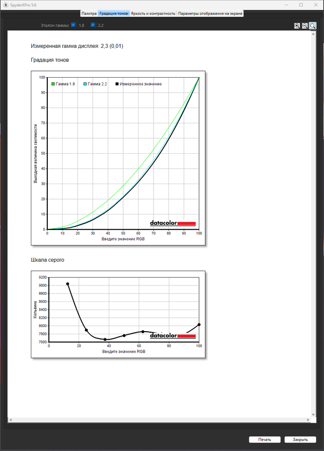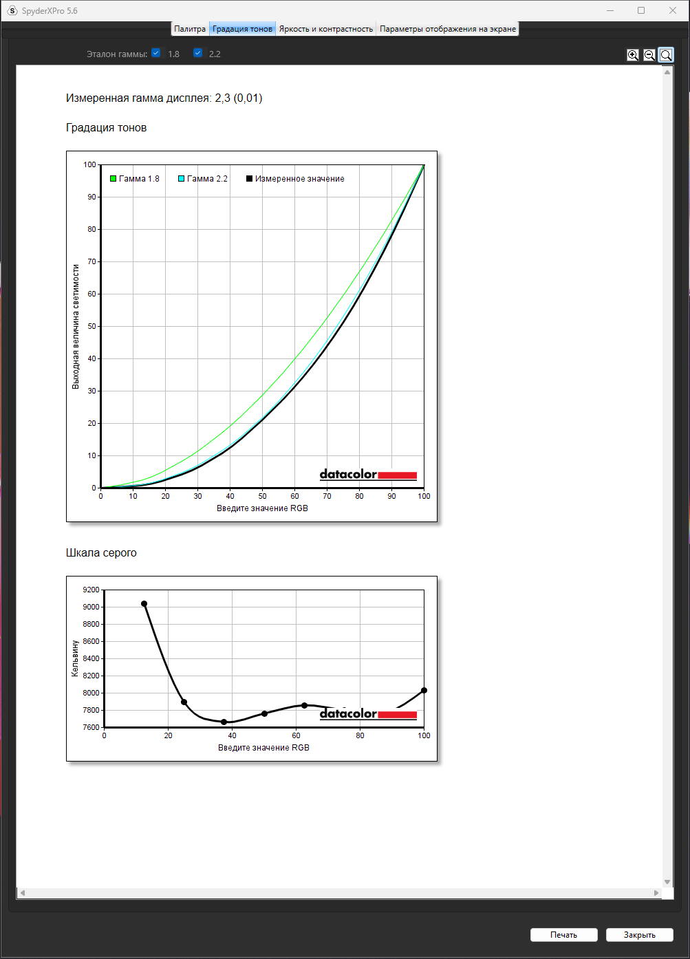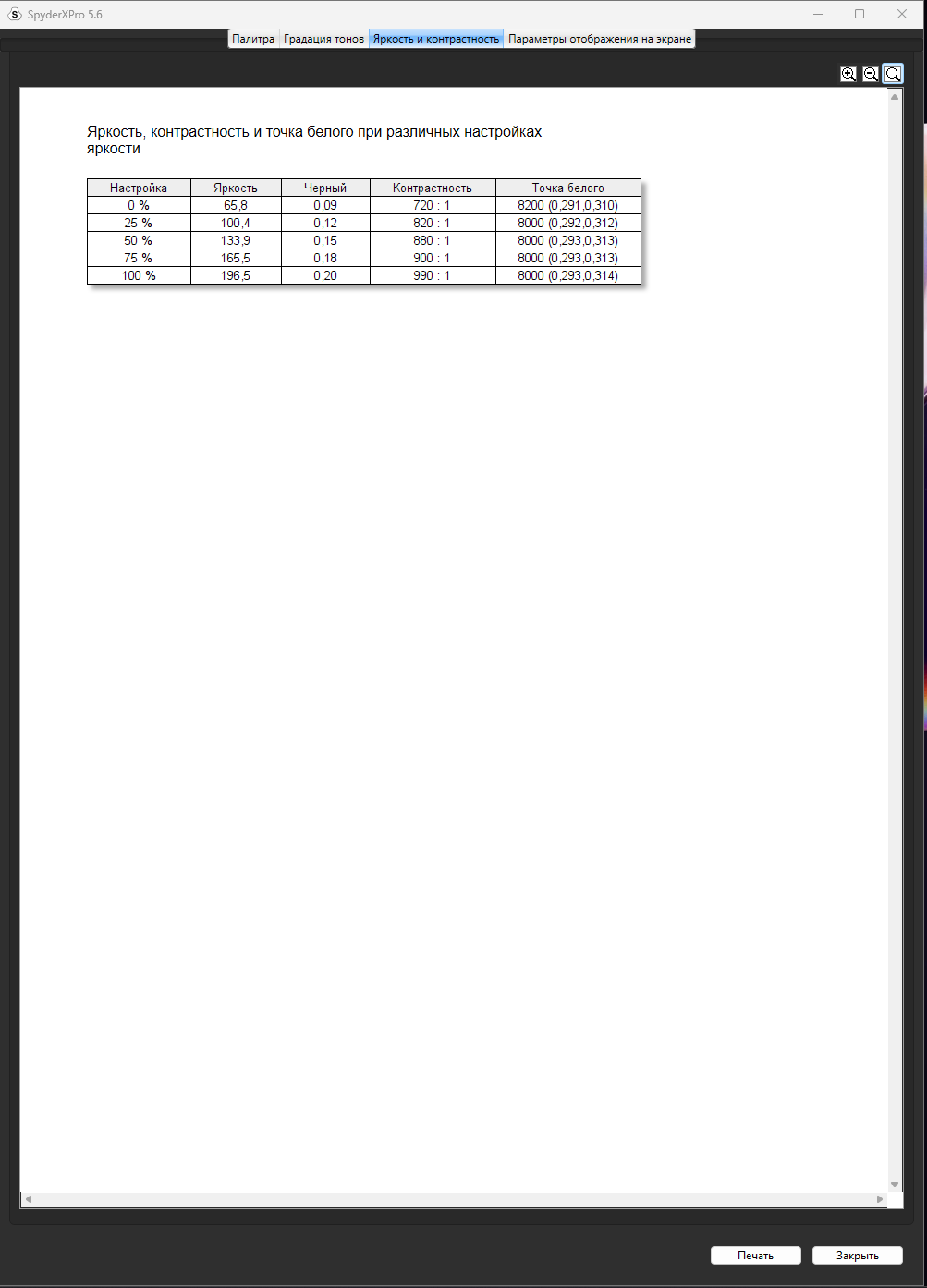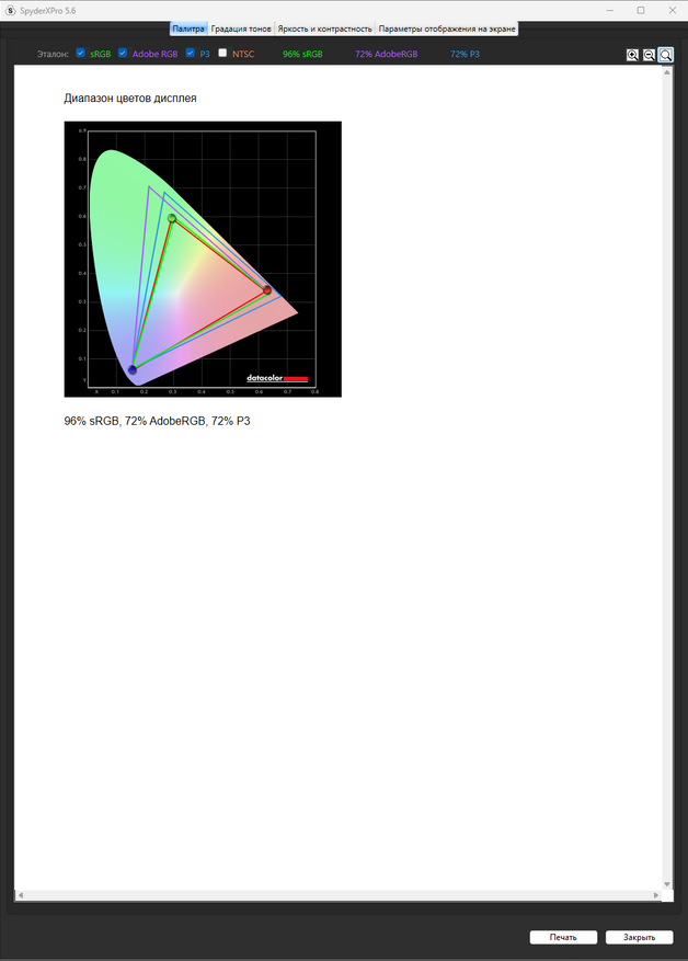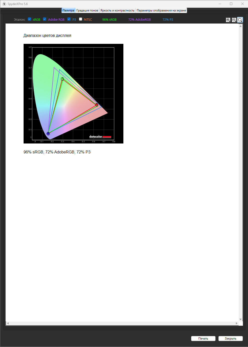 В ходе тестирования были получены следующие данные о цветовом охвате: 93% sRGB, 72% NTSC, 73% Adobe RGB и 76% DCI-P3. Максимальная яркость составила 189 кд/м².