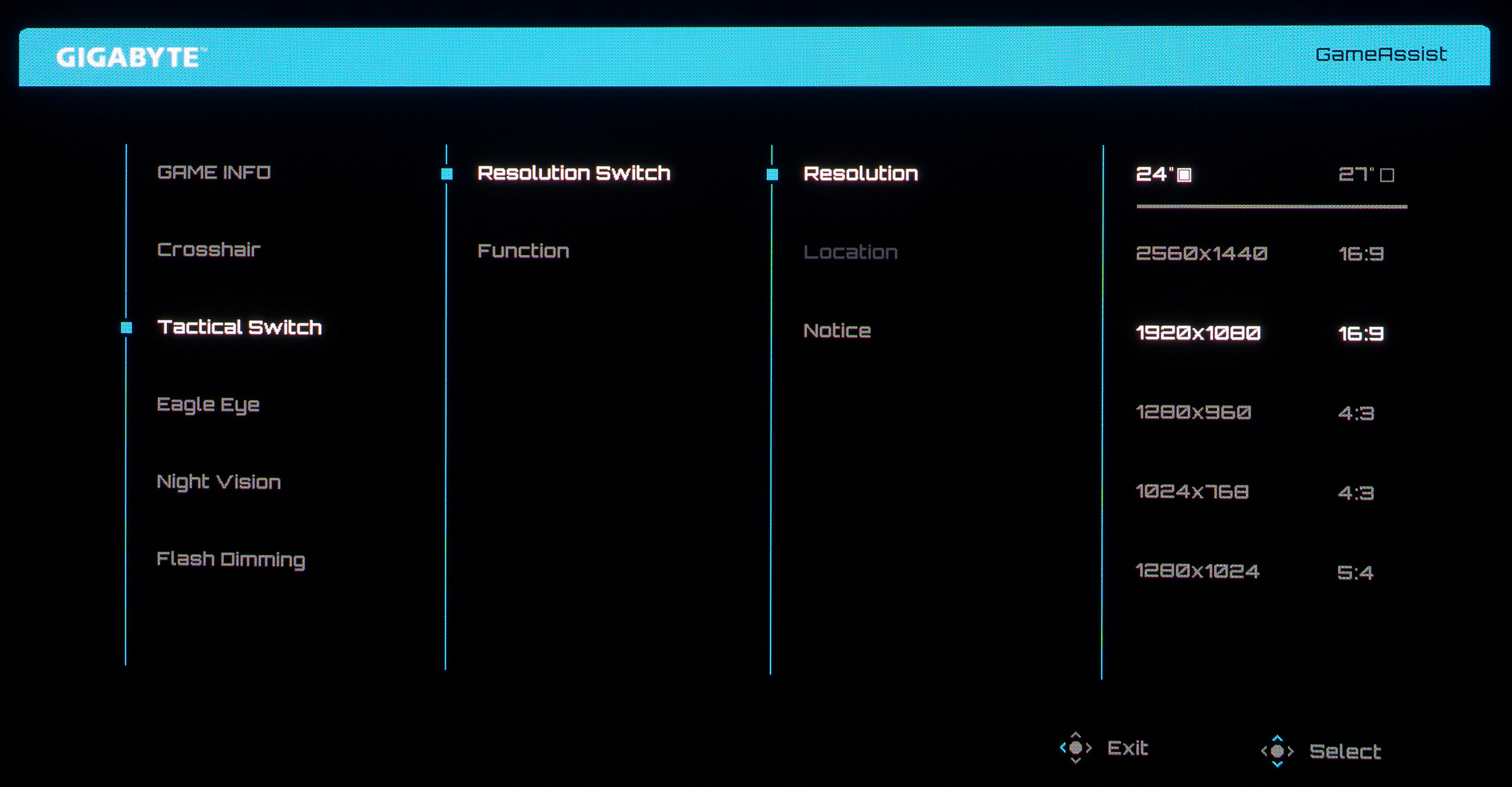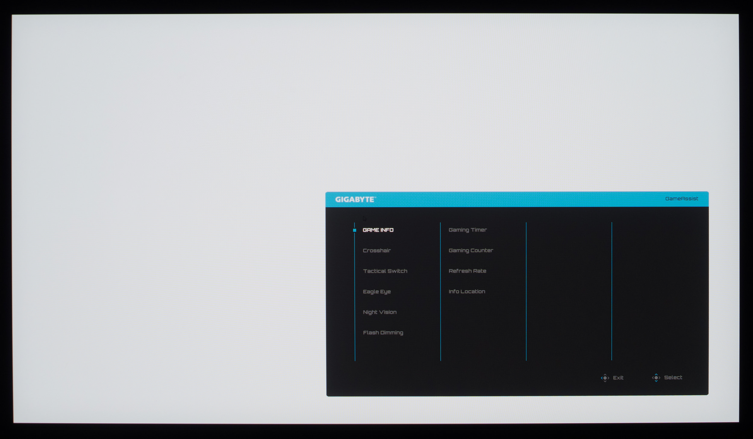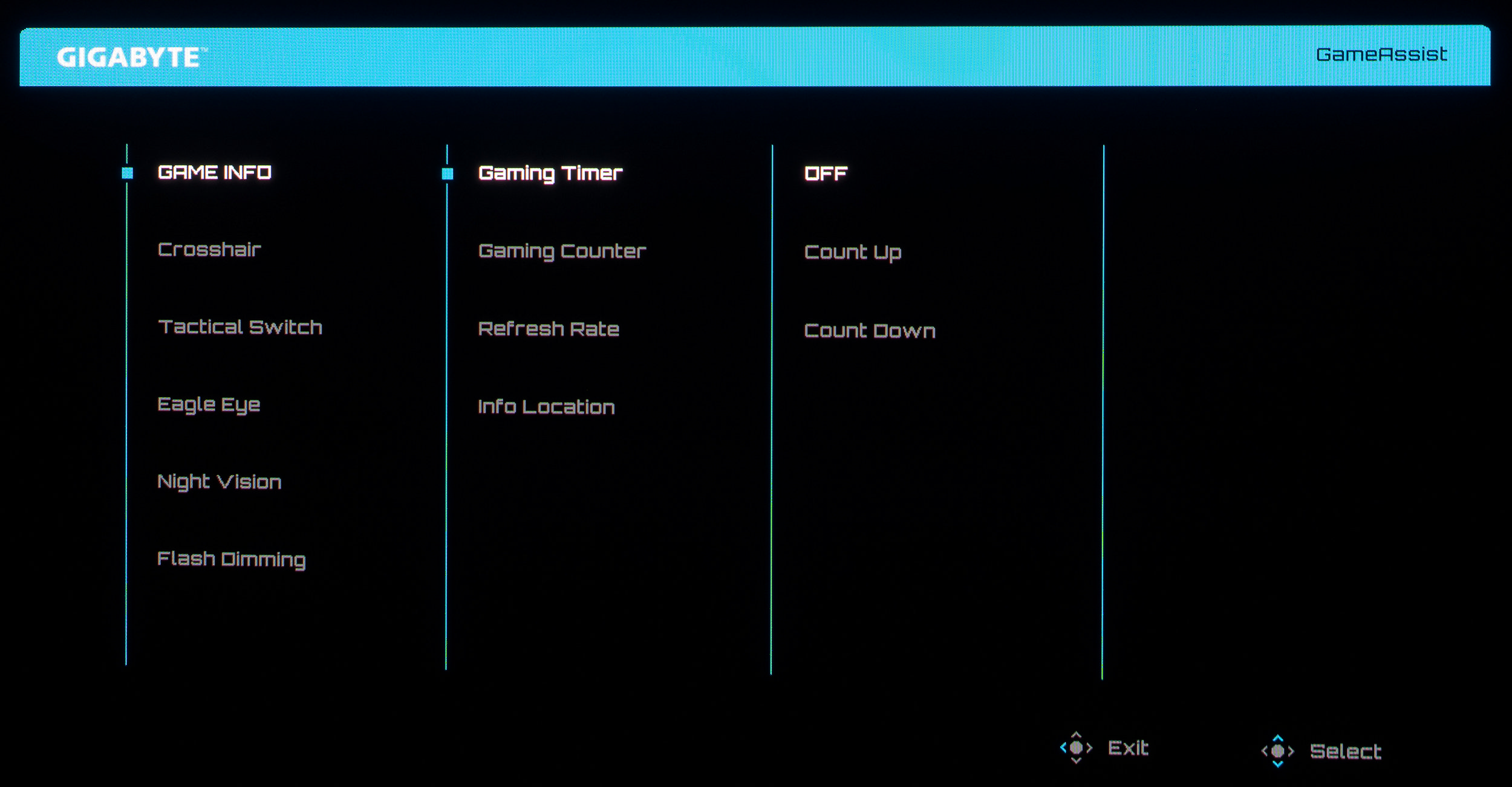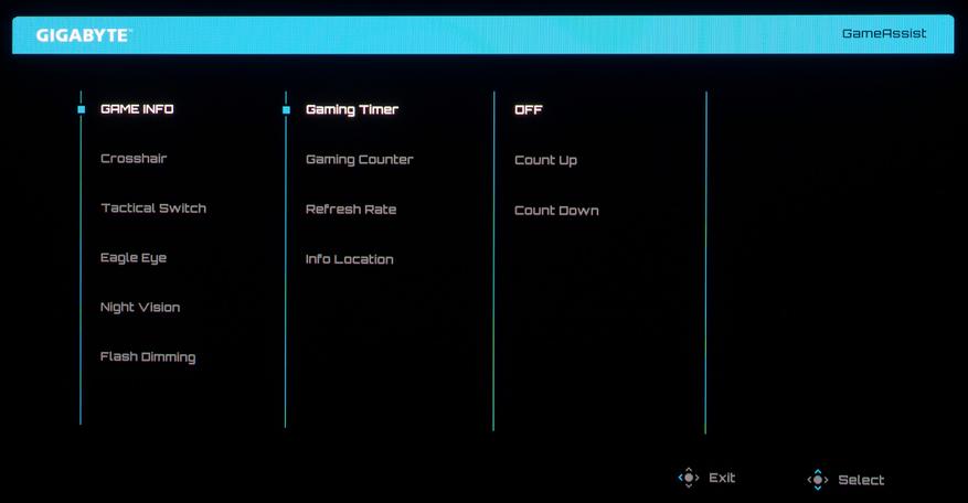 В подразделе Game Assist собраны фирменные игровые инструменты, которые давно используются в моделях Gigabyte. Все они служат одной цели: дать больше контроля над отображением в зависимости от жанра игры, текущей задачи и индивидуальных предпочтений. Иначе говоря, речь идёт о наборе сервисных опций, с помощью которых монитор проще адаптировать под конкретный игровой стиль и запросы пользователя.