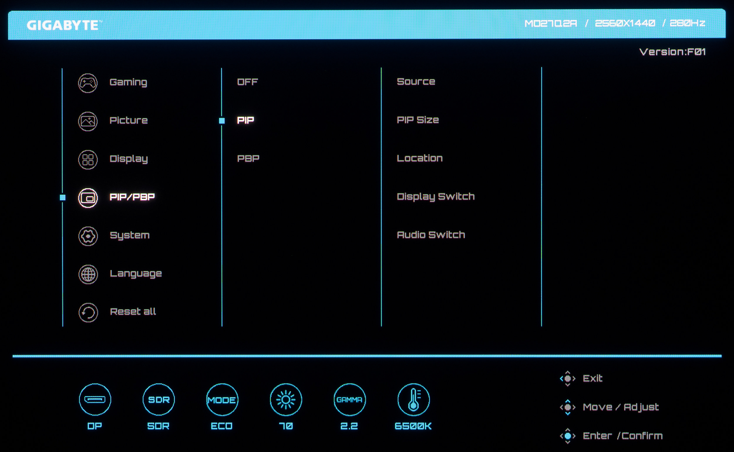 Следующий блок меню посвящён режимам PiP и PbP. Здесь пользователь может более тонко настроить то как будут выстроены изображения с нескольких источников сигнала на экране монитора.