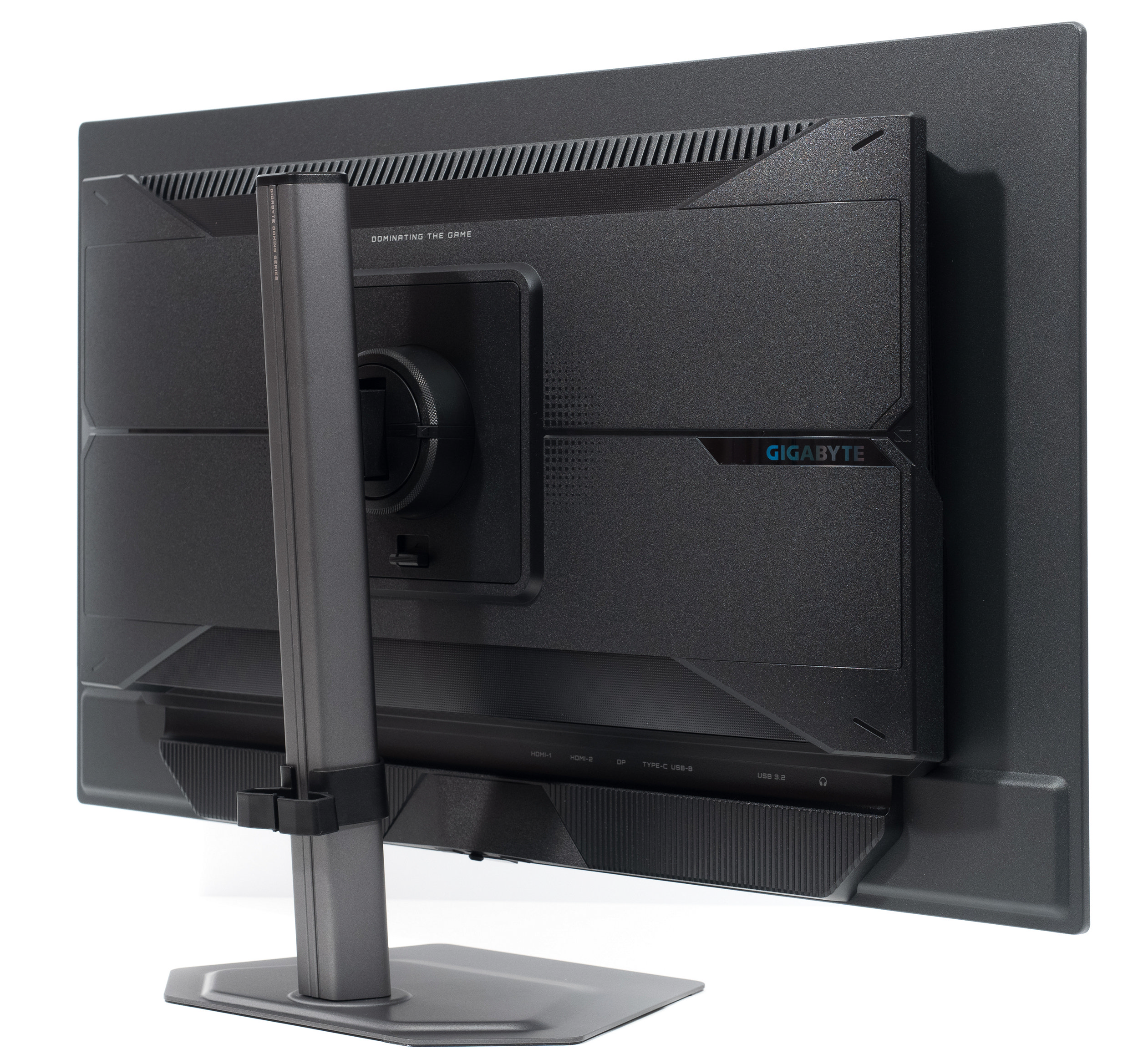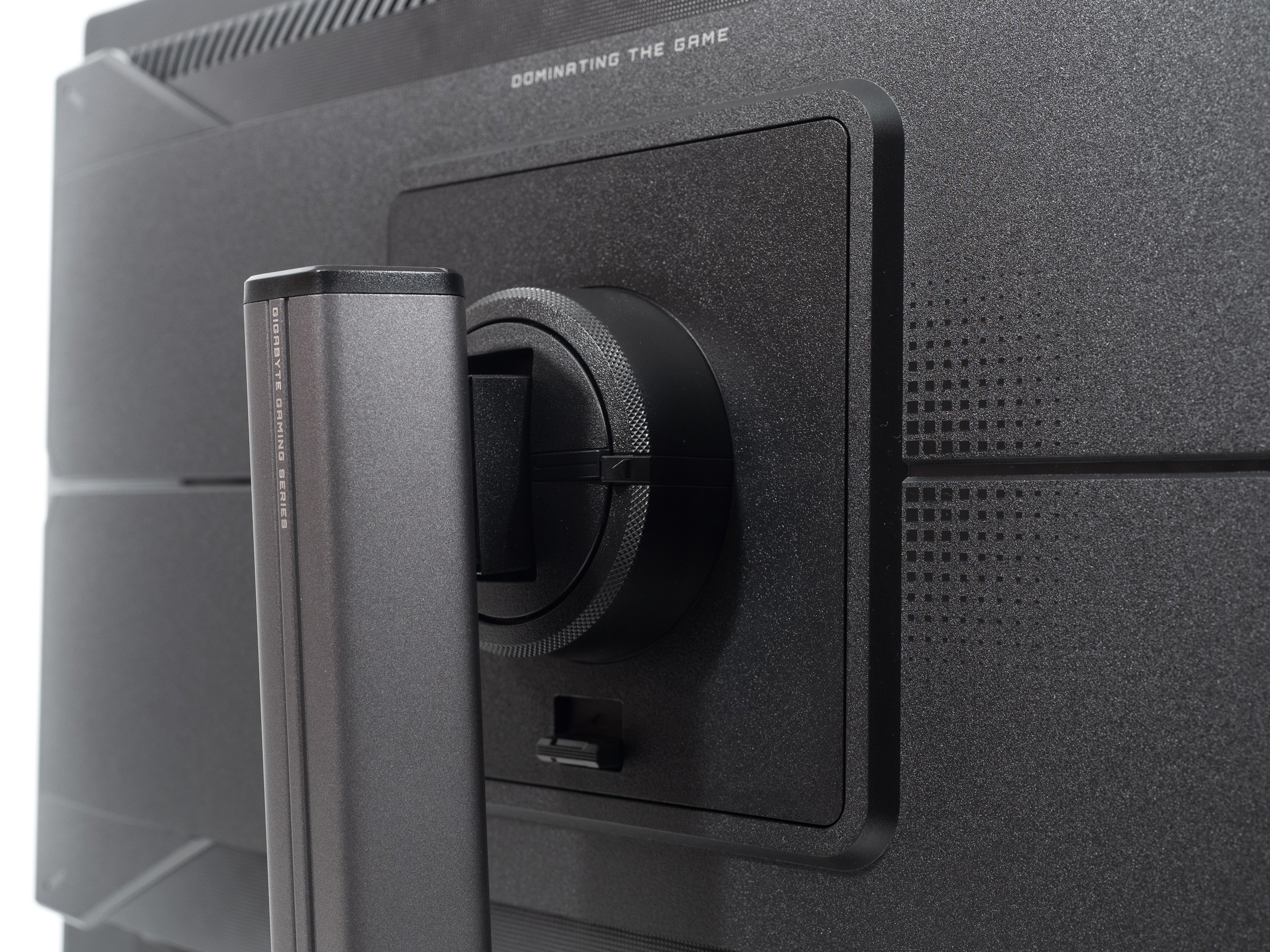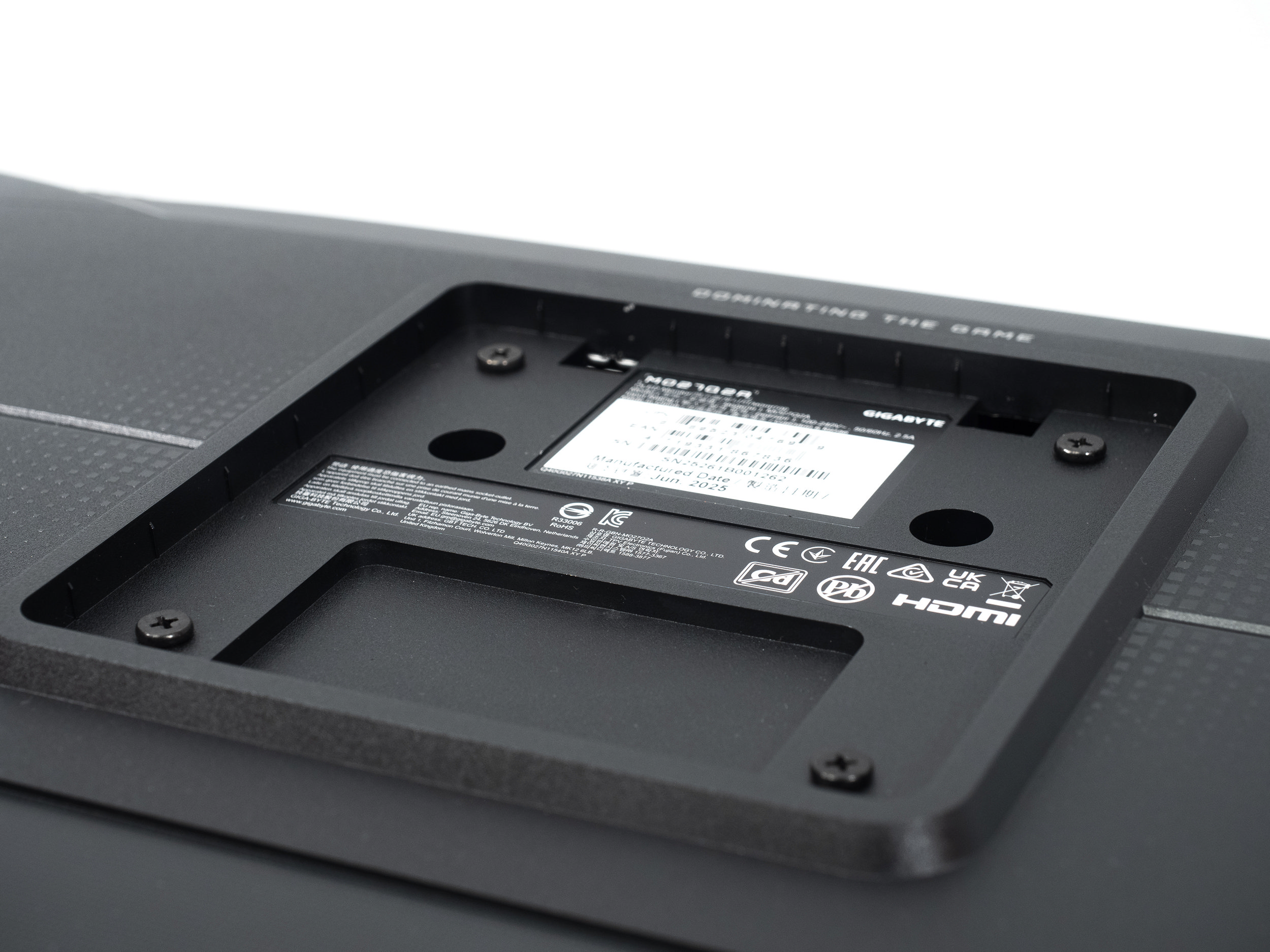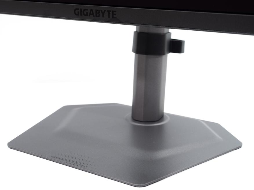 На фоне моделей Gigabyte, выходивших пару лет назад, сильнее всего бросается в глаза переработанная подставка. Она стала лаконичнее по форме, занимает меньше места на столе и воспринимается заметно актуальнее с точки зрения дизайна. Вертикальная опора теперь смотрится тоньше и аккуратнее, а само основание лишилось прежней массивности. Впрочем, на практичности это не сказалось: в его основе по-прежнему используется стальной лист небольшой толщины, которому за счёт штампованного профиля обеспечили необходимую прочность. Завершает конструкцию тёмно-серое порошковое покрытие.