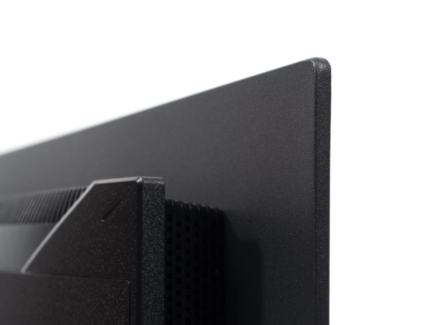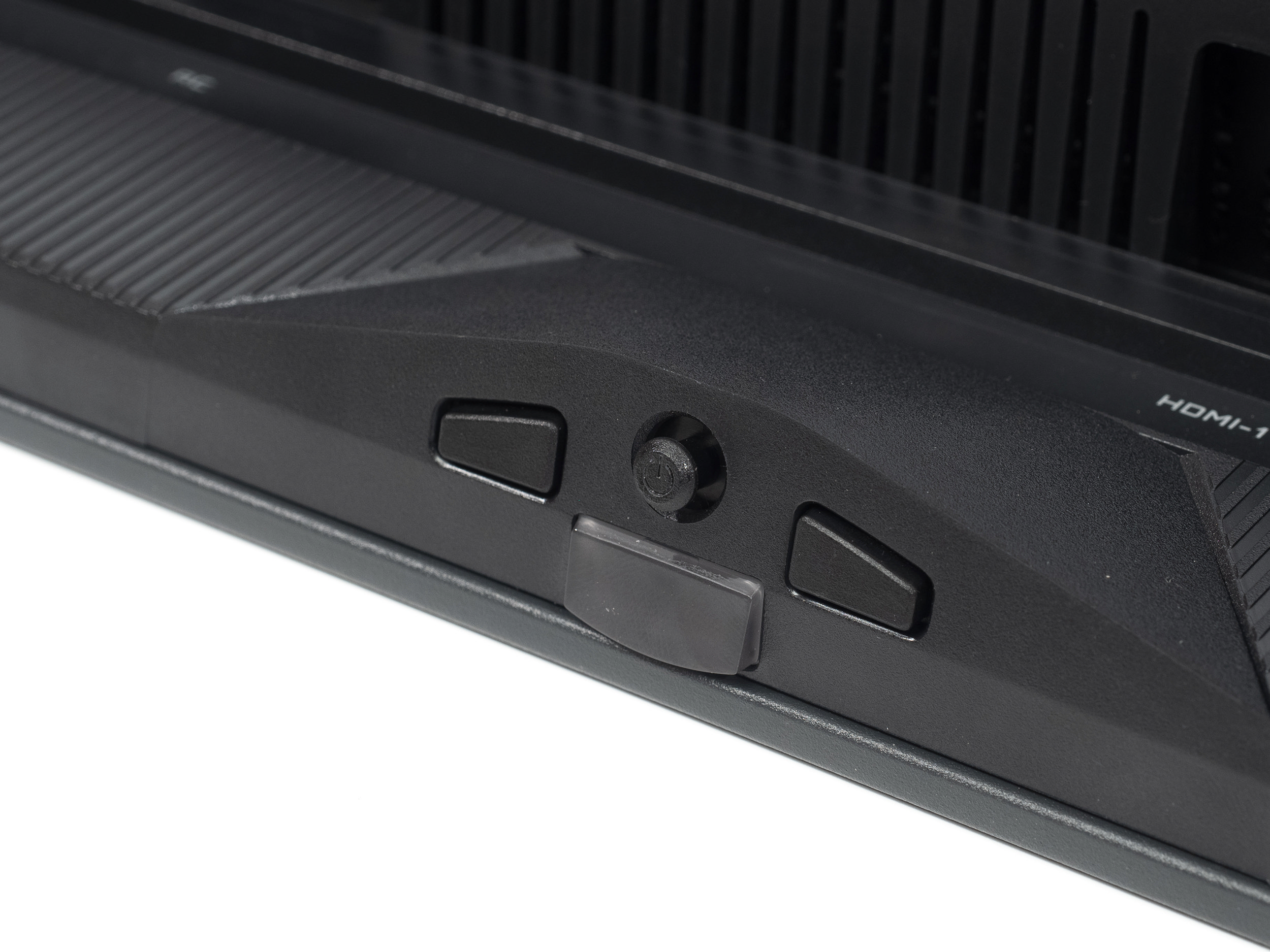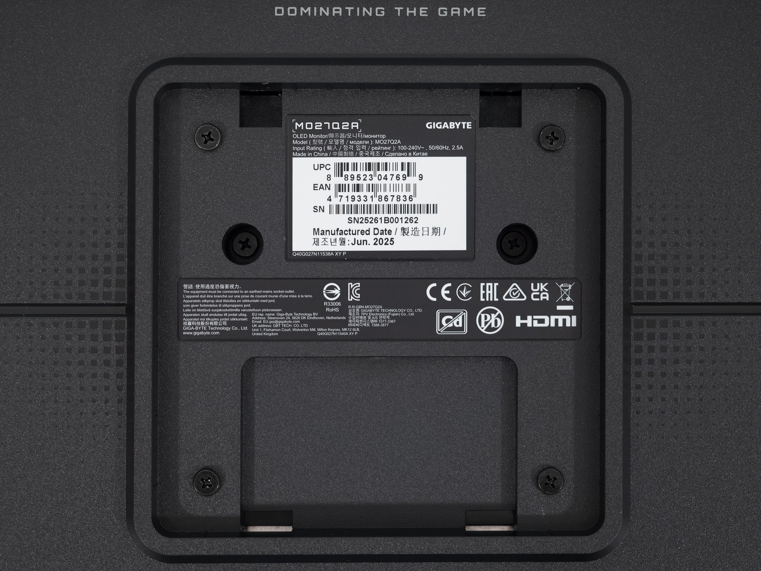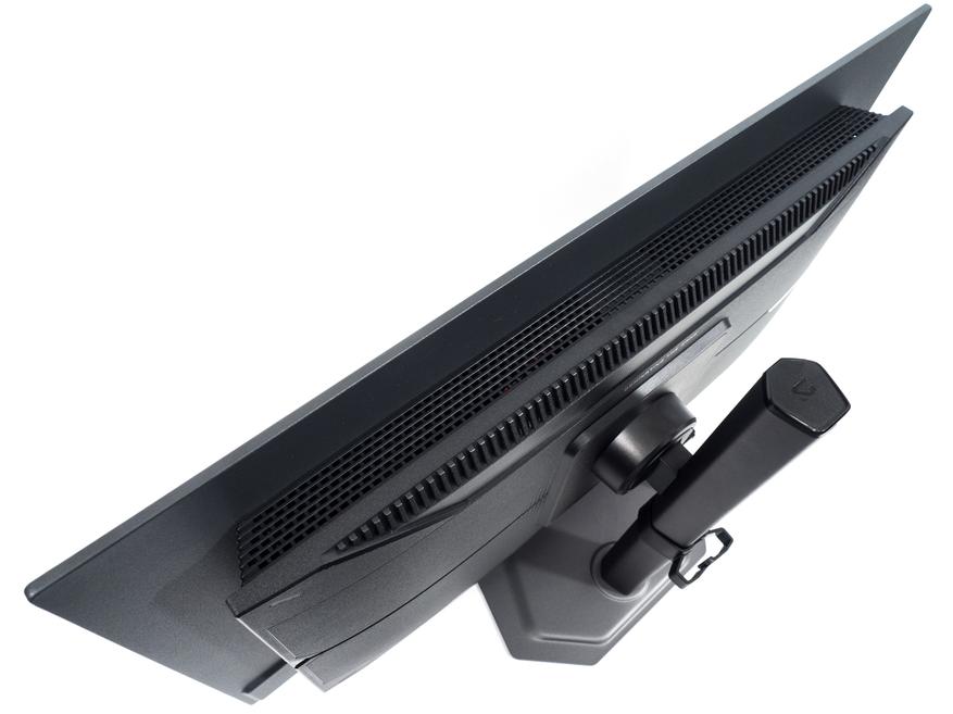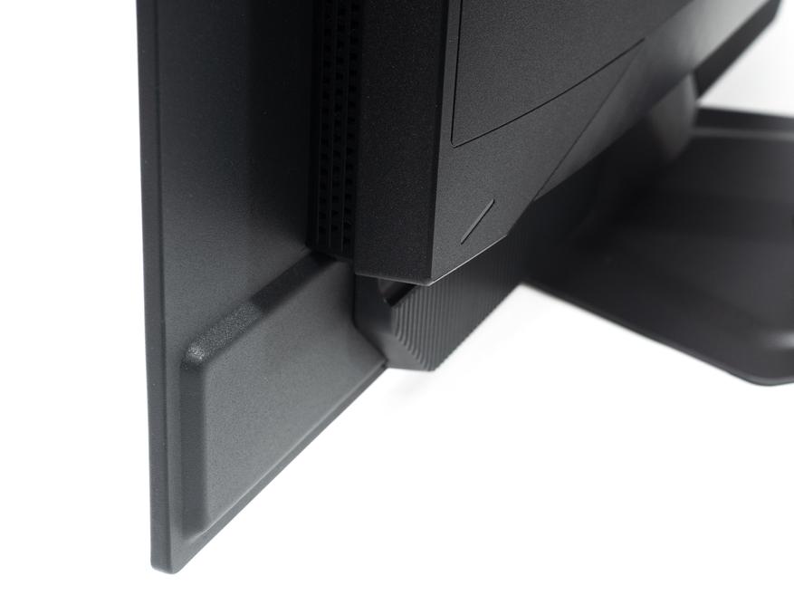 На фоне моделей Gigabyte, выходивших пару лет назад, сильнее всего бросается в глаза переработанная подставка. Она стала лаконичнее по форме, занимает меньше места на столе и воспринимается заметно актуальнее с точки зрения дизайна. Вертикальная опора теперь смотрится тоньше и аккуратнее, а само основание лишилось прежней массивности. Впрочем, на практичности это не сказалось: в его основе по-прежнему используется стальной лист небольшой толщины, которому за счёт штампованного профиля обеспечили необходимую прочность. Завершает конструкцию тёмно-серое порошковое покрытие.
