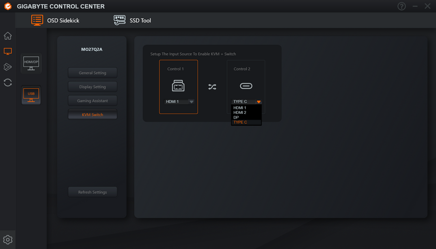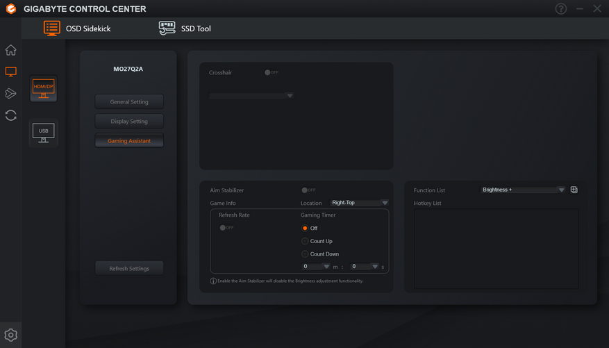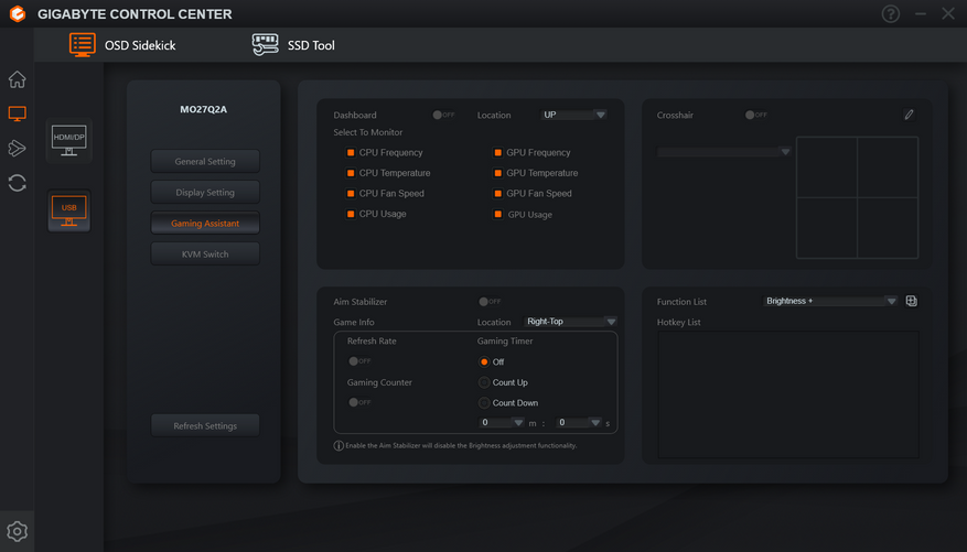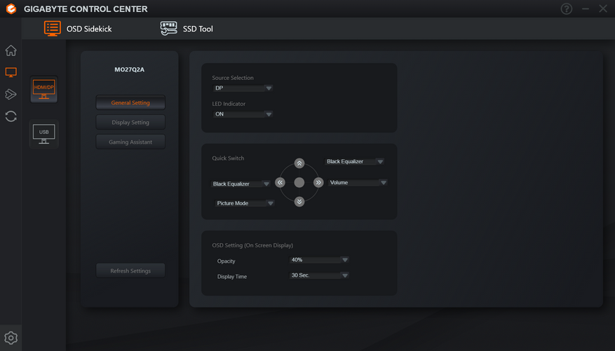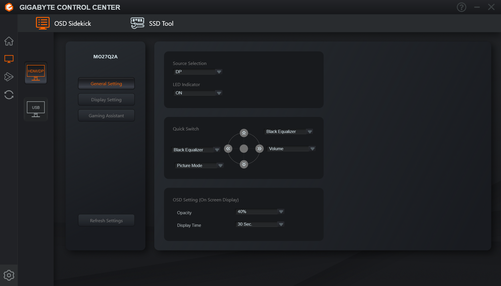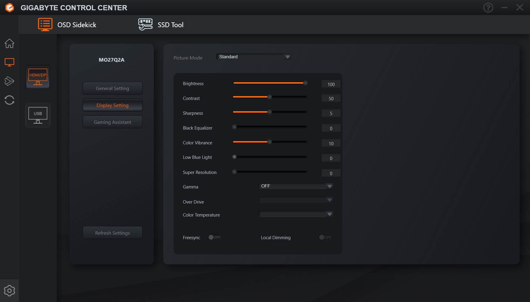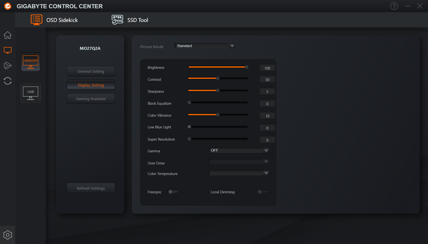 Управлять большинством настроек MO27Q2A можно не только через OSD-меню, но и из фирменного приложения Gigabyte Control Center. Во многих случаях это даже практичнее: параметры выводятся в более понятном и визуально удобном виде, а менять их можно прямо из среды Windows, не обращаясь к джойстику на корпусе. Для корректной работы программы монитор нужно связать с компьютером по USB Type-A либо через USB Type-C, если речь идёт о совместимом ноутбуке. Для полной совместимости также не будет лишним установить штатный драйвер дисплея с официальной страницы Gigabyte — это помогает избежать ограничений при обмене данными между устройством и ПО.