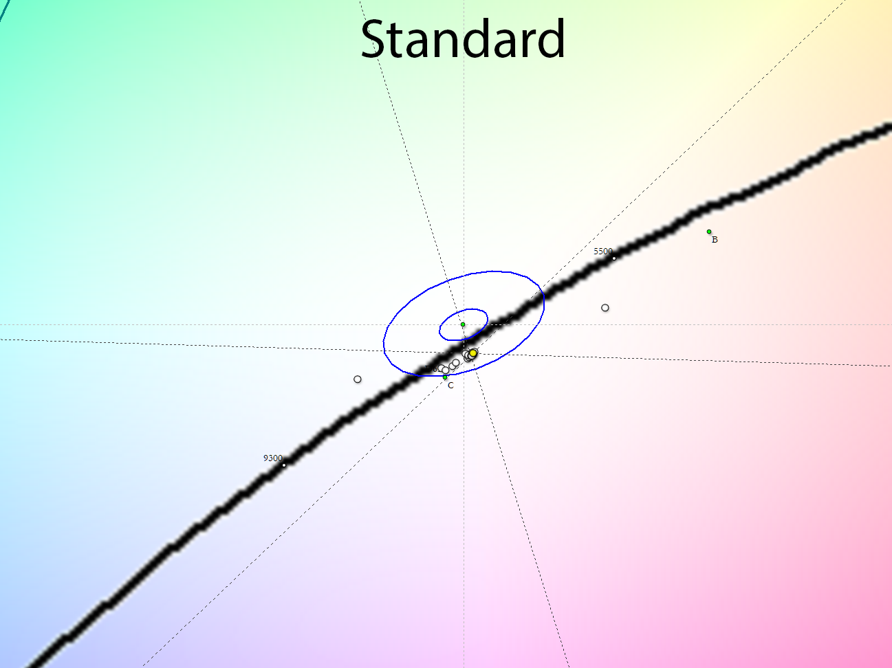 Для оценки поведения дисплея при изменении яркости за отправную точку был выбран режим Standard с заводскими значениями гаммы и цветовой температуры. Все базовые измерения выполнялись при 100% APL, то есть при полностью заполненном экране. Дополнительная серия замеров на малой площади изображения, в зоне 2-3% APL, существенной разницы не выявила: при стандартной работе APL Stabilize расхождение оказалось на уровне всего 1-2%. По этой причине отдельно закладывать его в итоговую оценку особого смысла нет.