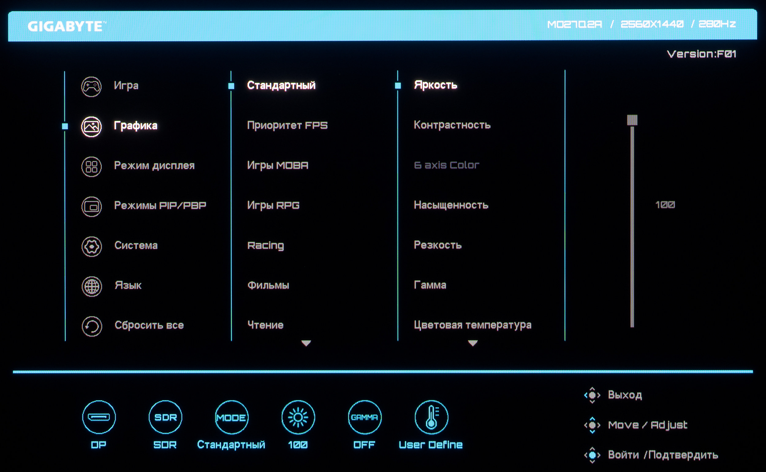 Проблем с настройкой и калибровкой MO27Q2A не возникло. Достаточно немного поправить баланс RGB, опустить яркость до комфортного уровня и при желании изменить настройку Gamma, отключив заводской вариант 2.2. После этого тёмные участки становятся чуть лучше различимы. Впрочем, при использовании корректного цветового профиля часть этих задач можно переложить на систему управления цветом (CMS), встроенную в ОС.