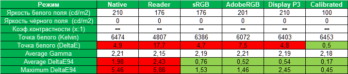 Если оценивать заводскую настройку по средним отклонениям DeltaE94, то нативный режим не стремится точно соответствовать какому-то одному стандарту. Он скорее пытается охватить всё сразу, из-за чего без цветового профиля добиться эталонной точности не получится. Примерно так же ведёт себя Reader. А вот отдельные пресеты sRGB, Display P3 и AdobeRGB настроены заметно аккуратнее и уже гораздо ближе к своим целевым параметрам.