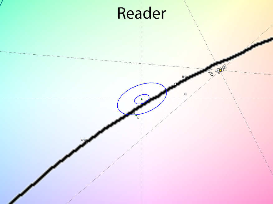 Reader, как и ожидалось, работает иначе. В нём появляется сдвиг RGB-баланса, контрастность немного снижается, а серые полутона переходят в более тёплую область. При этом выраженного паразитного оттенка почти нет, так что в повседневном использовании режим воспринимается спокойно. Но яркость здесь всё равно лучше уменьшать вручную, потому что сама по себе активация Reader не решает этот вопрос до конца. По сути, эффект во многом похож на простое переключение цветовой температуры в тёплый режим внутри стандартного профиля.