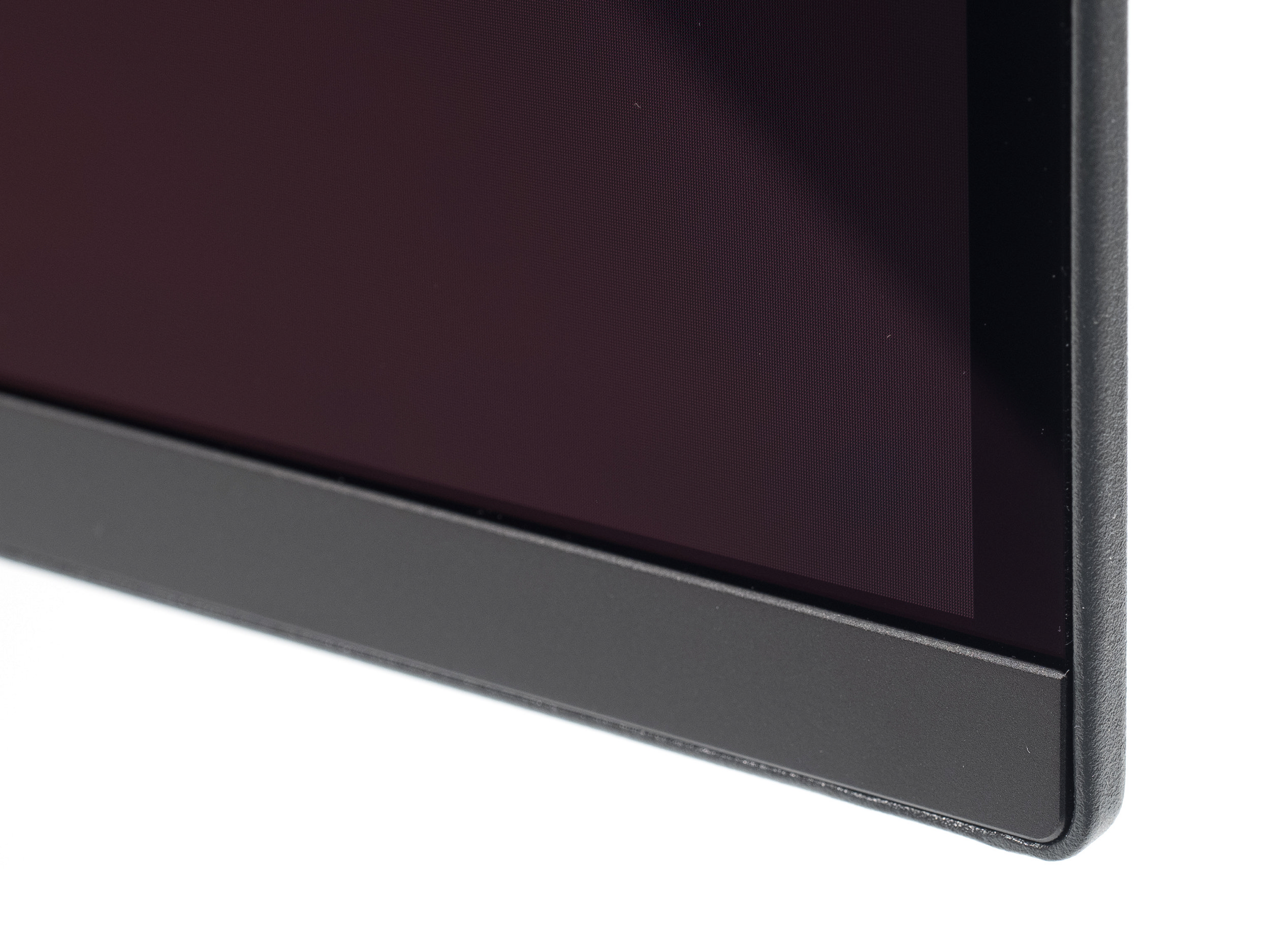 С точки зрения внешности модель оформлена в привычном для современных устройств формате. Экран выглядит почти безрамочным с трёх сторон, и лишь нижняя часть закрыта матовой пластиковой вставкой. Цветовое исполнение у монитора только одно — тёмное, близкое к чёрному.