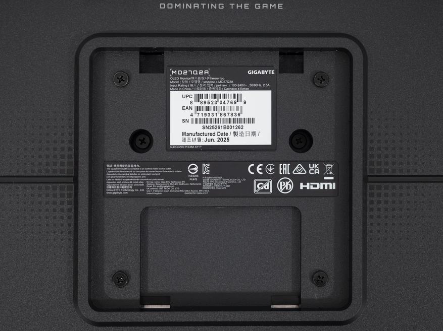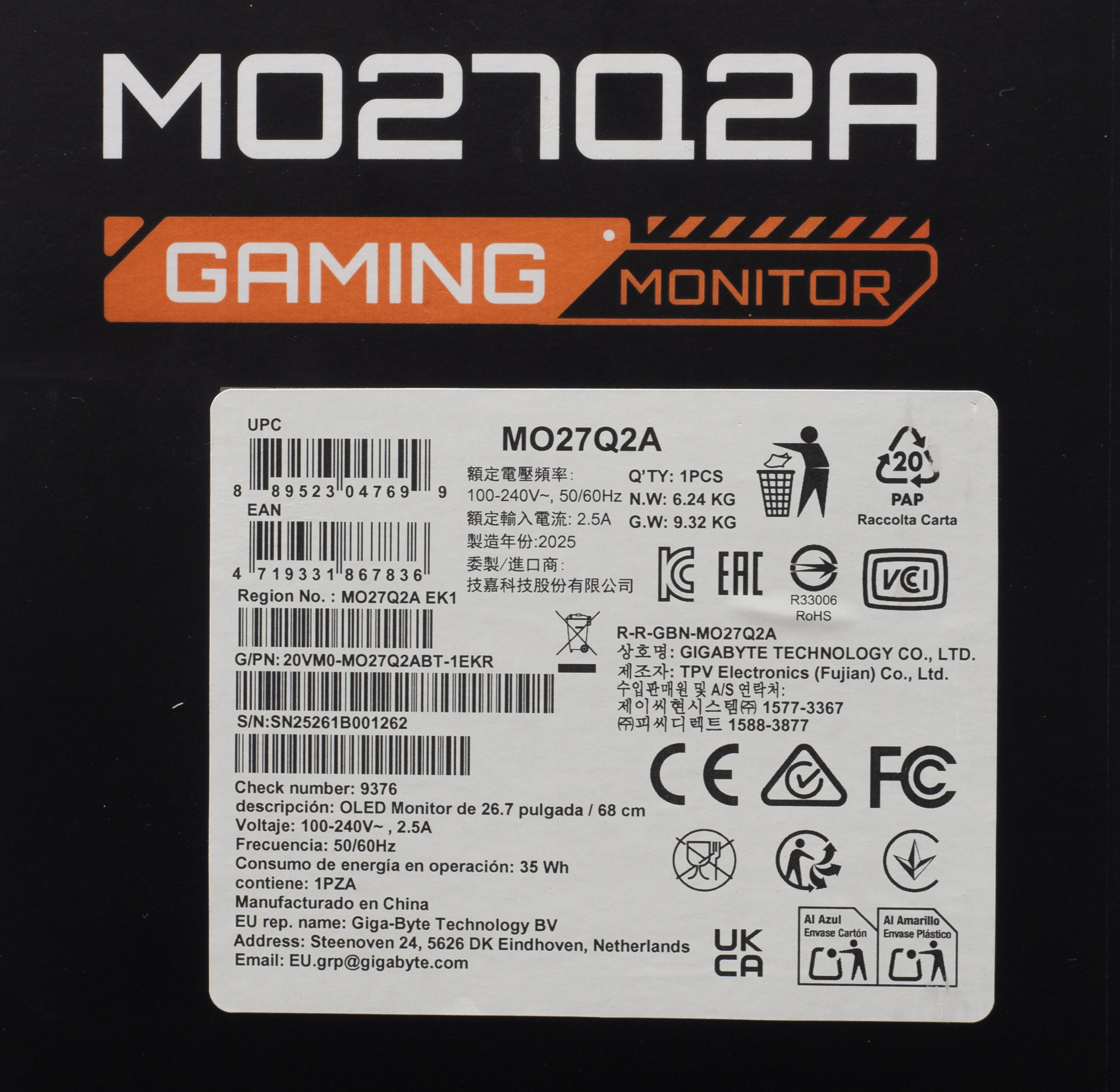 MO27Q2A упакован в красочно оформленную коробку средних габаритов. На одной из заводских наклеек собрана основная техническая информация об устройстве. Производится модель на фабрике в Китае. Конкретный экземпляр, который оказался у меня на тесте, выпущен на мощностях TPV Electronics (Fujian), выступающей подрядчиком бренда, в июне 2025 года.