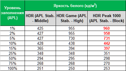 Наилучший результат по яркости ожидаемо обеспечил режим HDR Peak 1000. После выхода на стабильный уровень монитор удерживал около 960 нит, а кратковременный пик в первые секунды доходил приблизительно до 980-985 нит. При 100% APL яркость составляла 253 нита. Профиль HDR Game показал очень близкую модель работы и в целом ведёт себя схожим образом.