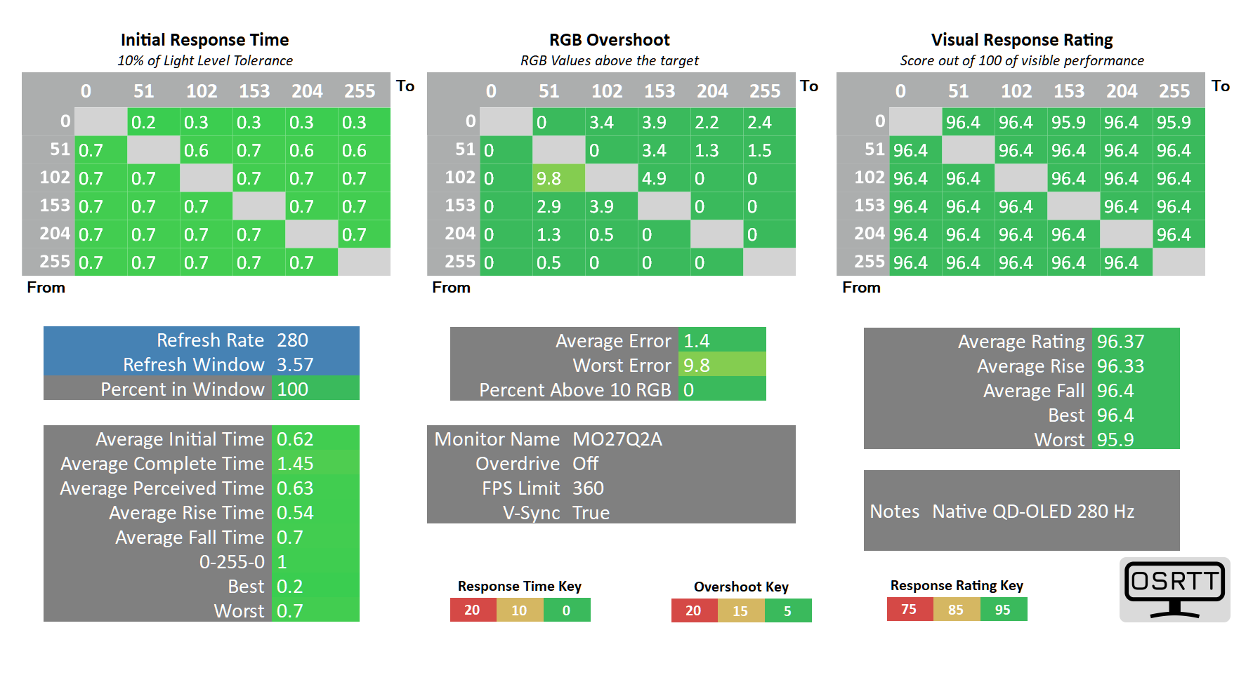 При использовании измерительного комплекса OSRTT и тестировании OLED я придерживаюсь рекомендации производителей и устанавливаю комфортные уровни допуска для всех подсчётов. В этом случае среднее время отклика не превысило 0,62 мс (по сути, это почти предел для используемого измерительного оборудования, фактические цифры в разы ниже), а переход от чёрного к белому и обратно произошёл не более чем за 1 секунду. Ни один LCD-монитор не способен на такое и близко. Артефакты на цифрах присутствуют, но они минимальные — увидеть их в реальных условиях практически невозможно.