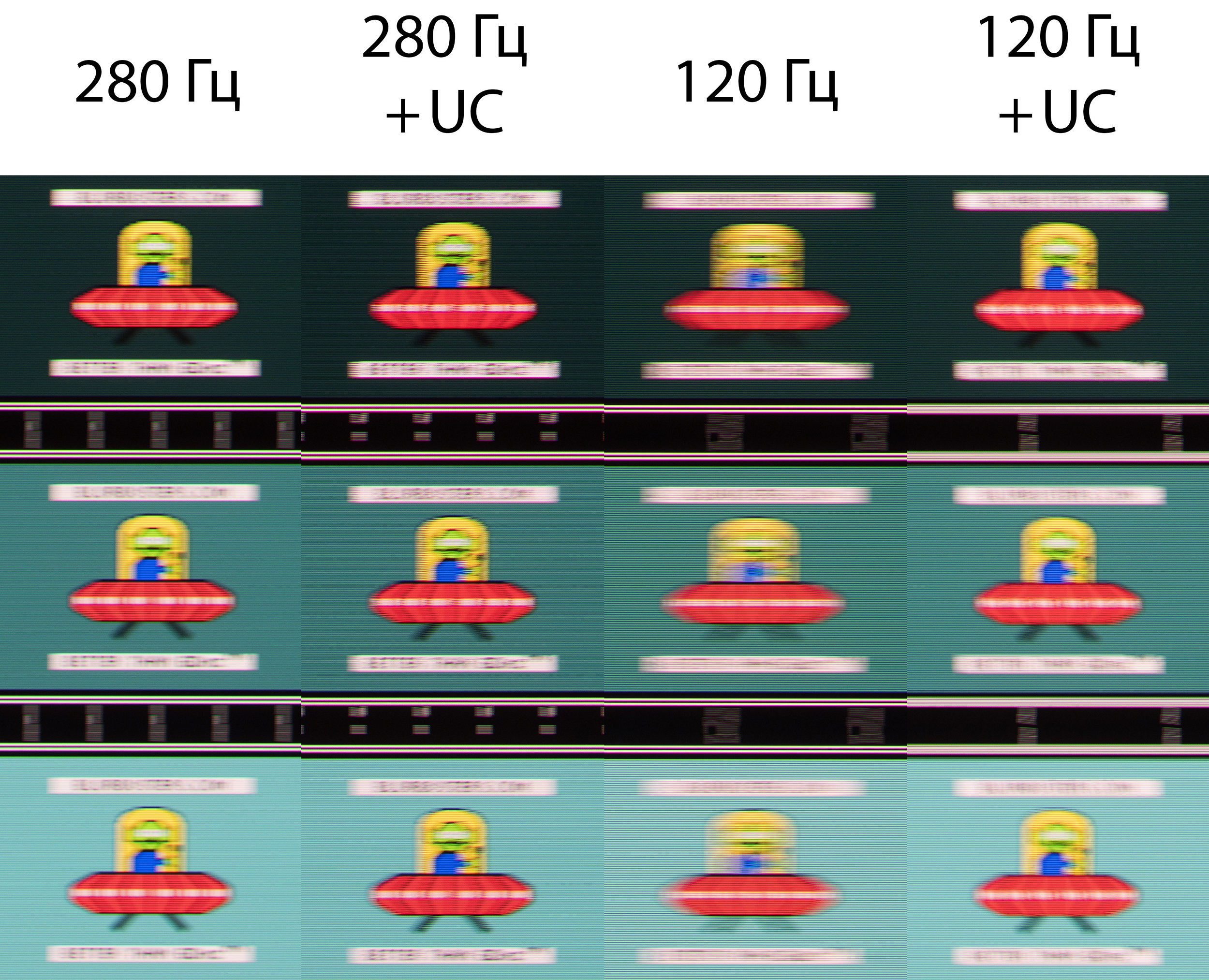Видно, что установка 280 Гц значительно увеличивает чёткость и плавность картинки, а вставка «чёрного кадра» на такой частоте лишь незначительно увеличивает оба показателя. В случае 120 Гц история более показательная — Ultra Clear провоцирует значительно более чёткую картинку на экране (статичного изображения этот вывод, безусловно, не касается), но до уровня 280 Гц всё равно далеко.
