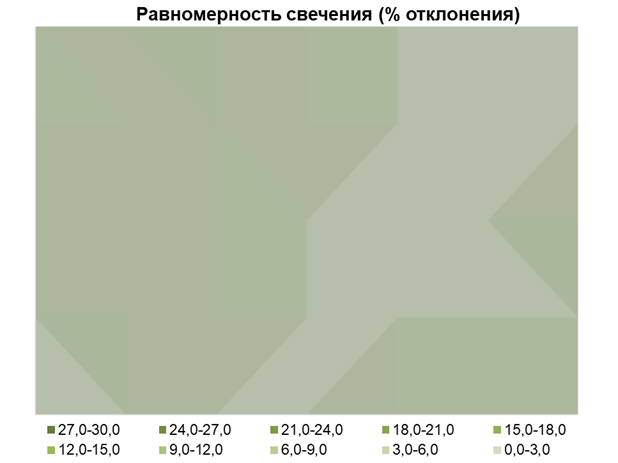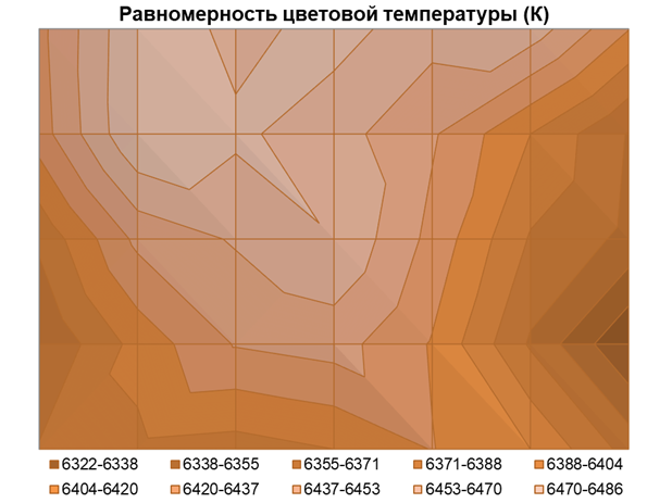 С цветовой температурой ситуация столь же удачная. Среднее отклонение относительно центра оказалось на уровне 0,8%, а максимальное не вышло за 2,3%. Общий разброс по экрану ограничился примерно 164 К, а такая разница в реальных условиях почти не воспринимается глазом, особенно с учётом того, как именно распределяются эти отклонения.